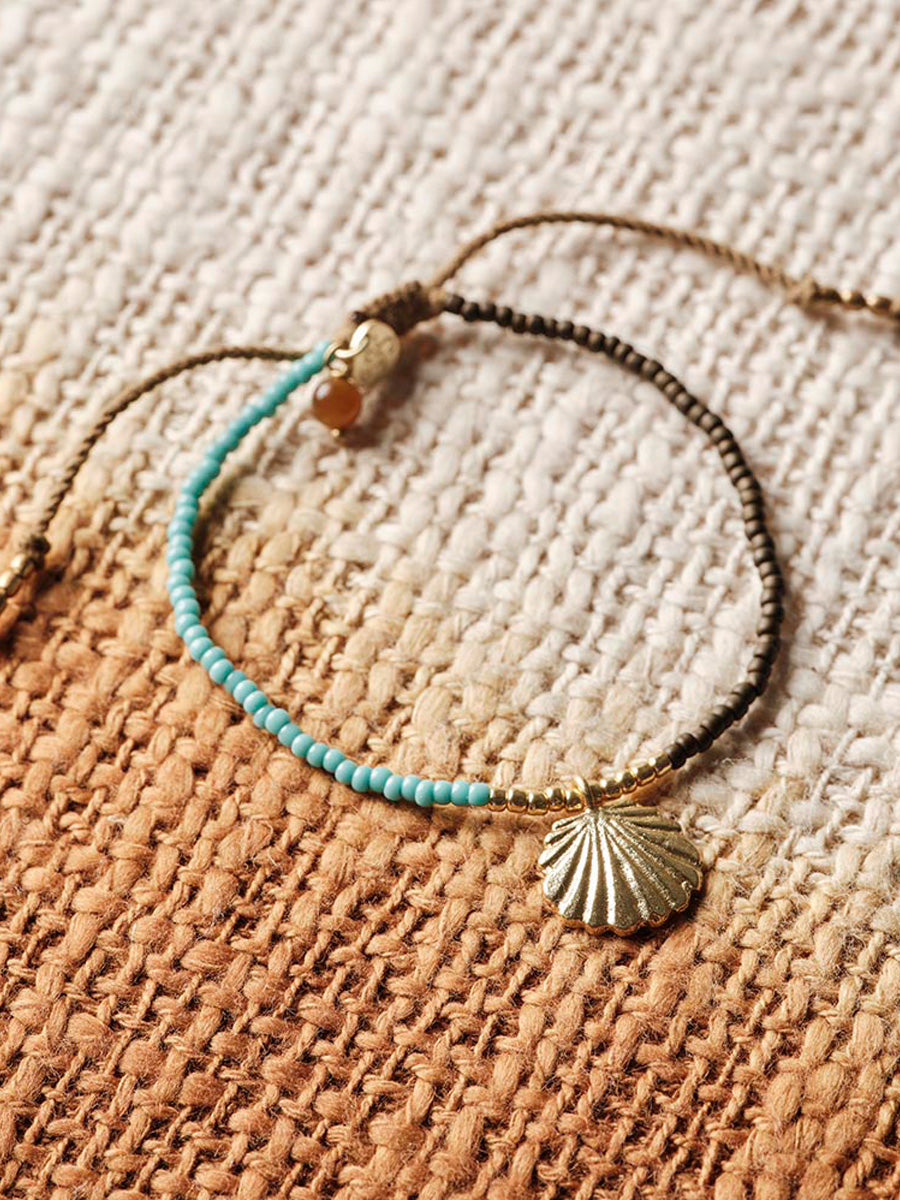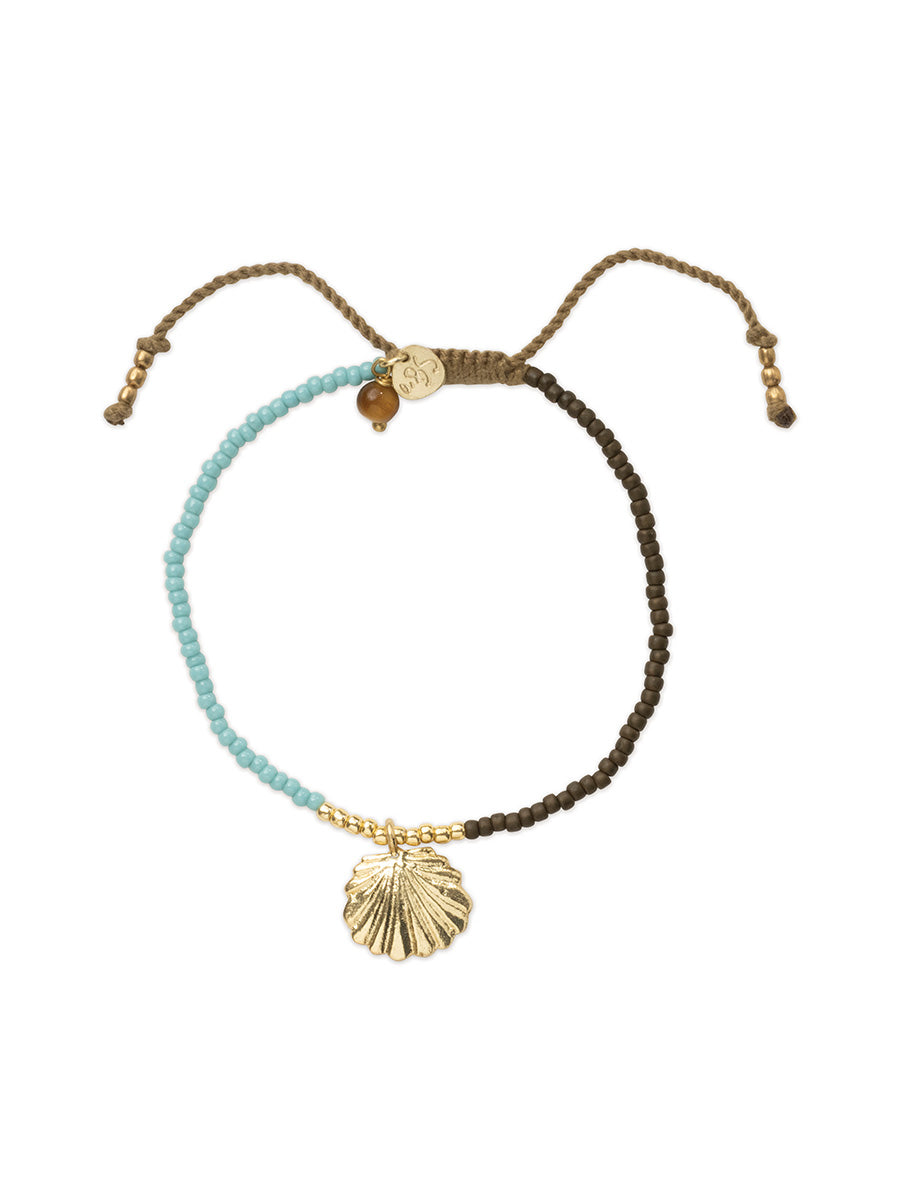 Tässä A Beautiful Storyn Hoping-rannekoru koostuu eri värisistä lasihelmistä, pienestä tiikerinsilmä-kivestä sekä kauniista simpukkariipuksesta. Puuvillalangasta punottu liukusolmu ja messinkihelmet tekevät koosta säädettävän.
