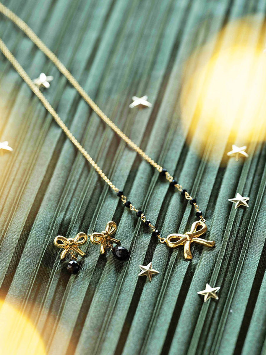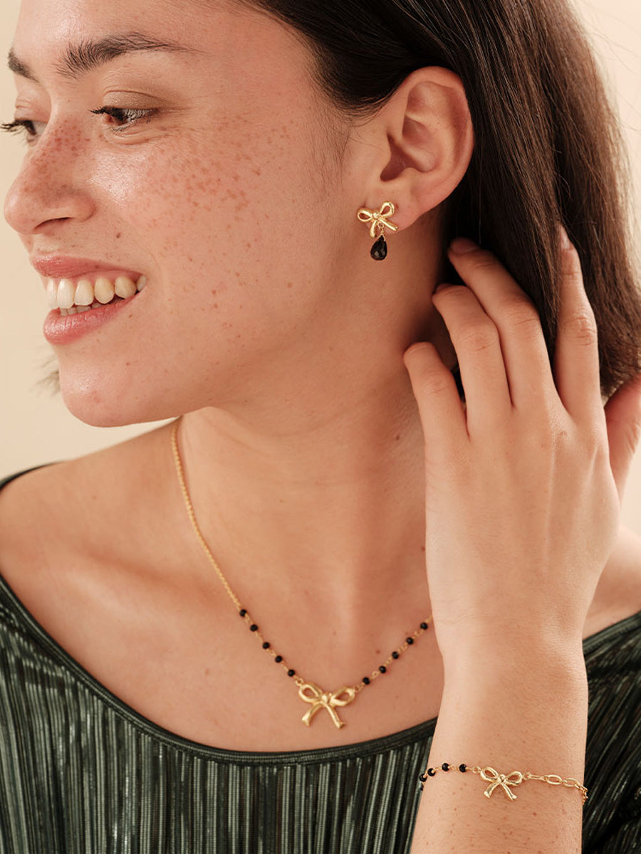 Tässä A Beautiful Storyn korvakoruissa kultapäällysteiset rusetit ja kevyesti heiluvat fasetoidut onyksi-kivet muodostavat säihkyvän ja elegantin parin. Ne heijastavat valoa upeasti ja tuovat asuun hienostunutta juhlavuutta – täydellinen lahja ystävälle tai itselle. Jokainen onyksi on luonnon ainutlaatuinen luomus, joten korun sävy ja vivahde voivat vaihdella kauniisti yksilöittäin.
