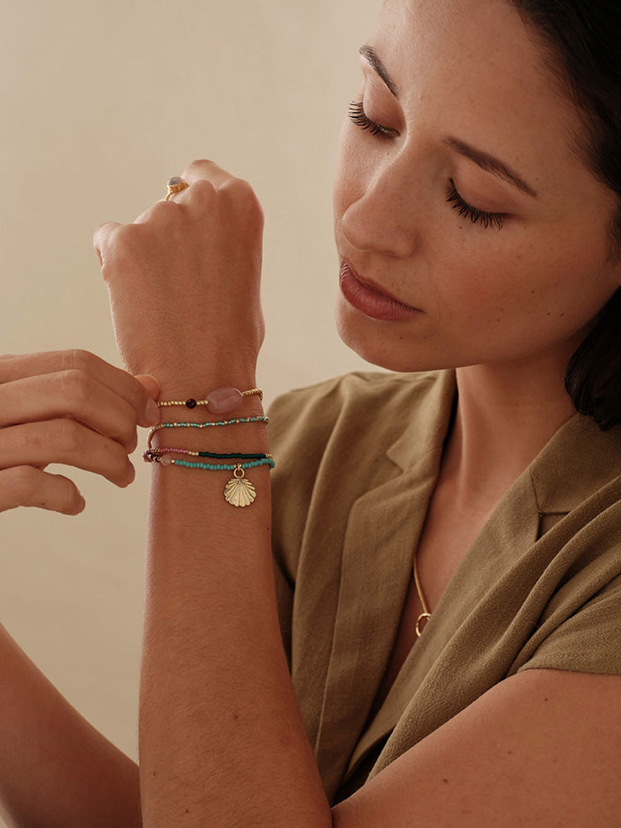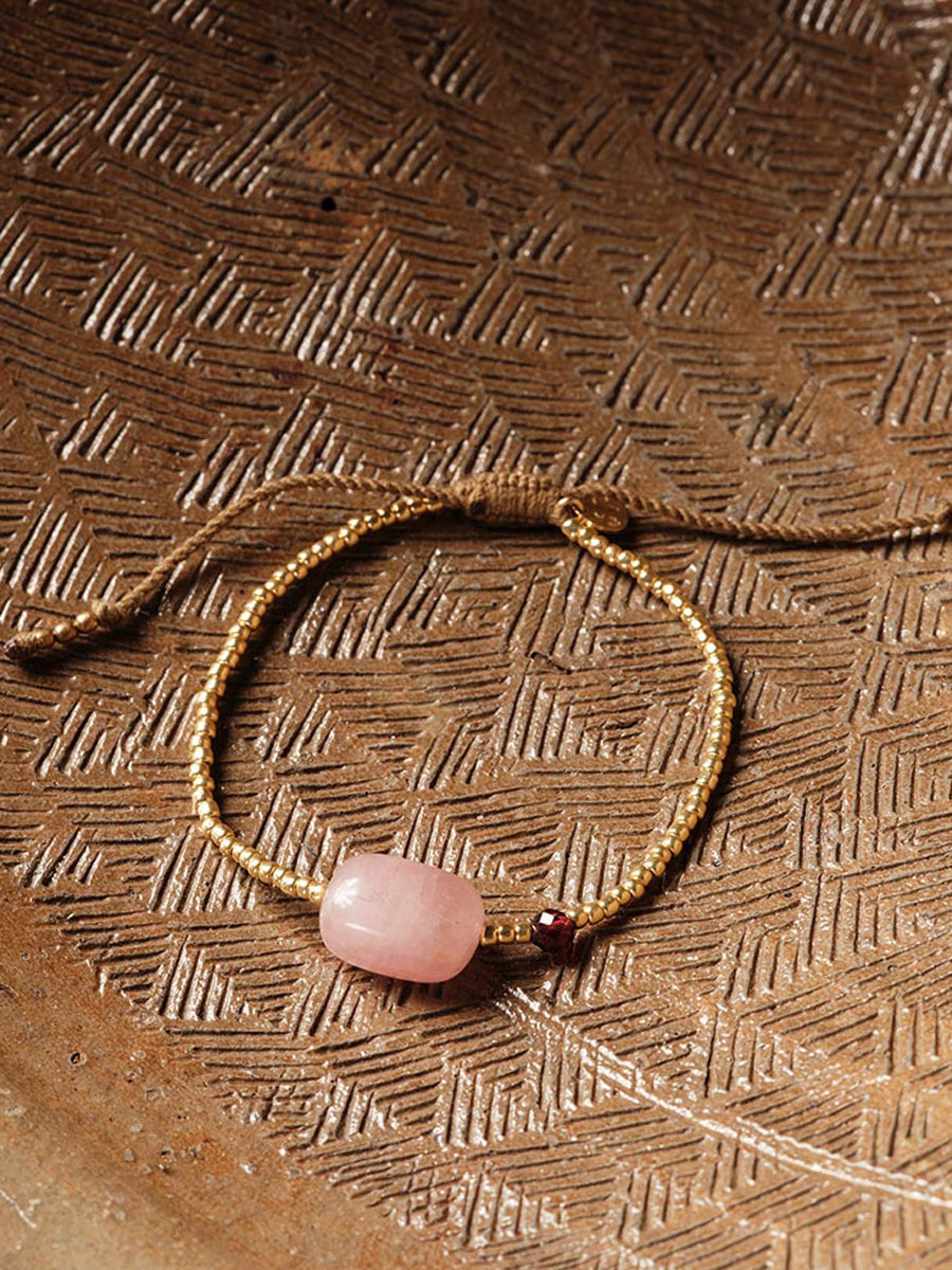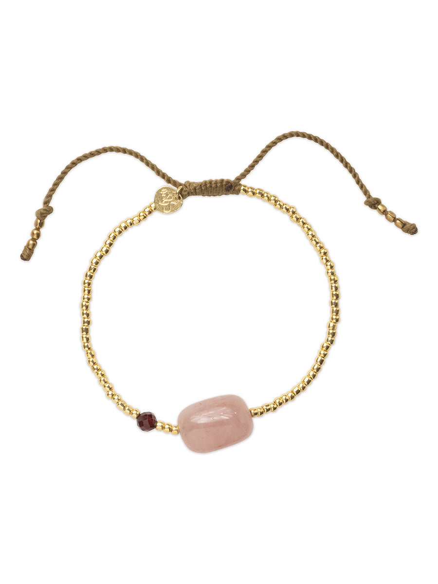 Tässä A Beautiful Storyn Surprise-rannekorussa kullansävyiset lasihelmet kehystävät suurta ovaalia ruusukvartsia ja pientä pyöreää granaattikiveä. Puuvillalangasta punottu liukusolmu ja messinkihelmet tekevät koosta säädettävän.
