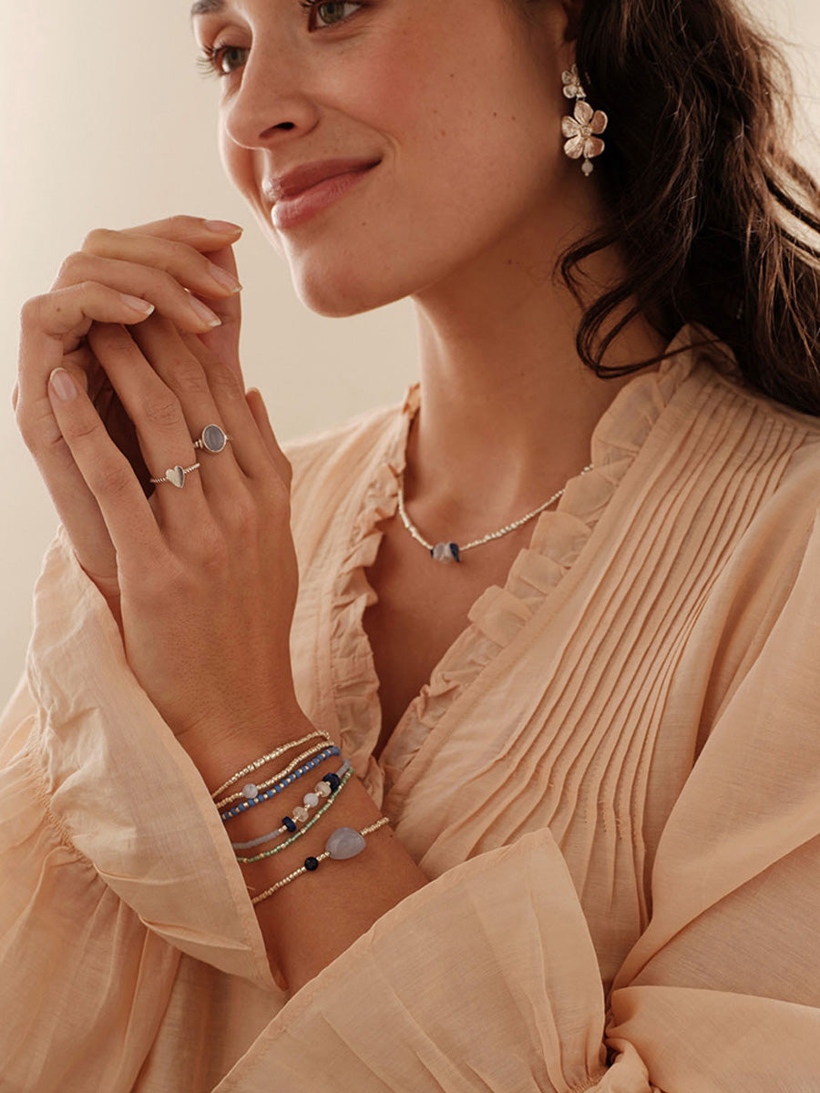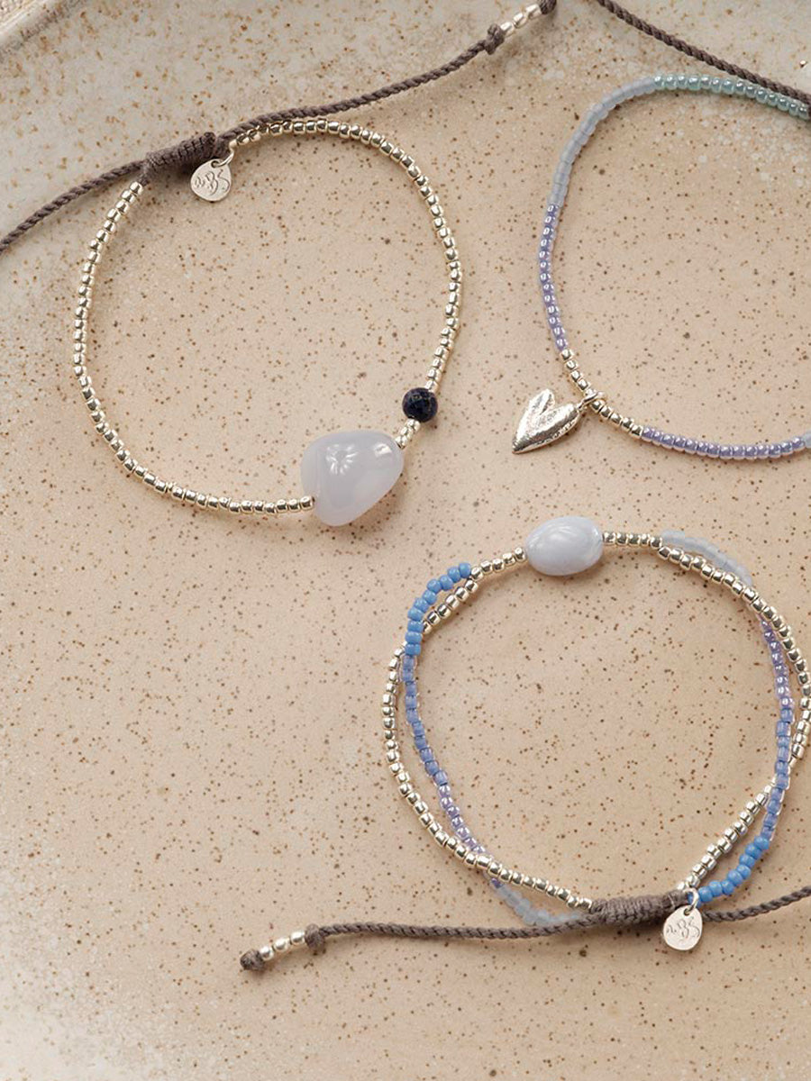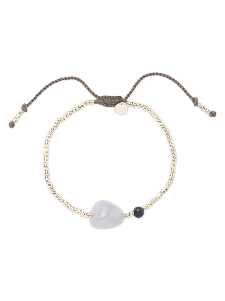 Tässä A Beautiful Storyn Surprise-rannekorussa hopeansävyiset lasihelmet kehystävät suurta ovaalia sinistä pitsiakaattia ja pientä pyöreää lapis lazuli -kiveä. Puuvillalangasta punottu liukusolmu ja messinkihelmet tekevät koosta säädettävän.