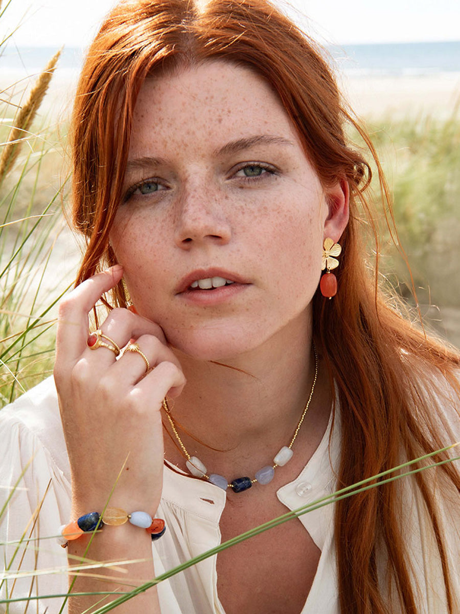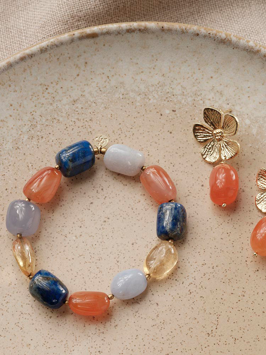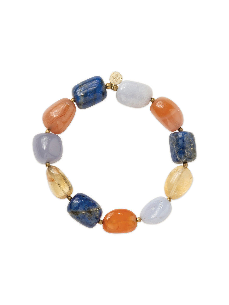 Tässä A Beautiful Storyn Worthy-rannekorussa suuret, sileäpintaiset sinisen pitsiakaatin, lapis lazulin, karneolin ja sitriinin kivet yhdistyvät kullansävyisiin lasihelmiin. Joustava rakenne tekee korusta helpon pukea ja mukavan käyttää.