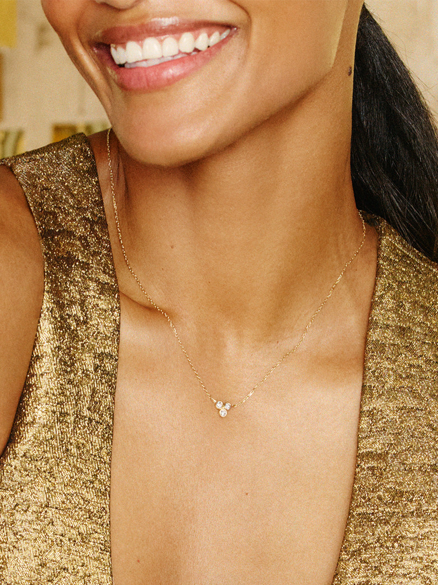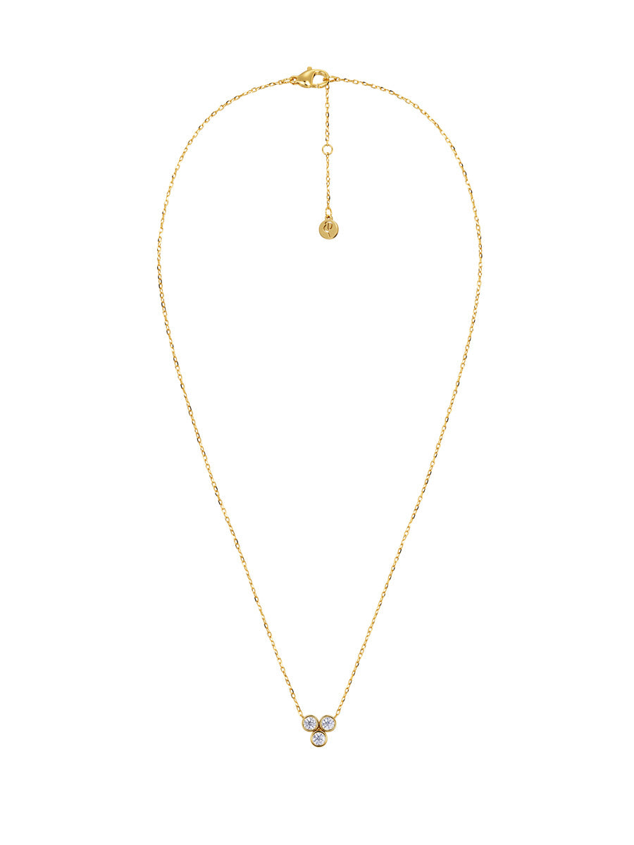 Tässä Edbladin sirossa kaulakorussa on kolmen pienen kimaltavan kiven rykelmä. Valmistettu nikkelivapaasta, ruostumattomasta kirurgin teräksestä ja päällystetty 14 karaatin kultauksella.