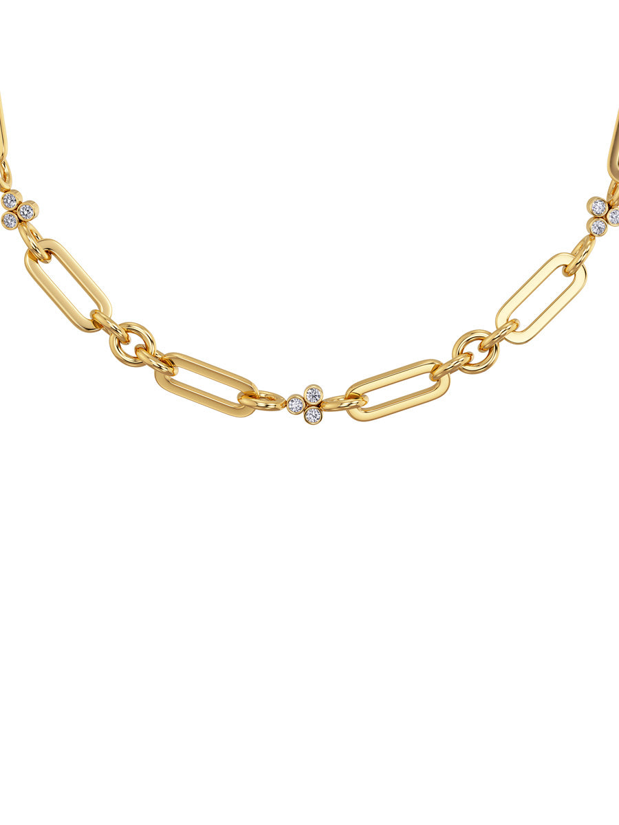 Tässä Edbladin upeassa kaulakorussa yhdistyy erimuotoiset lenkit ja sirot kimaltavat kivet. Valmistettu nikkelivapaasta, ruostumattomasta kirurgin teräksestä ja päällystetty 14 karaatin kultauksella.