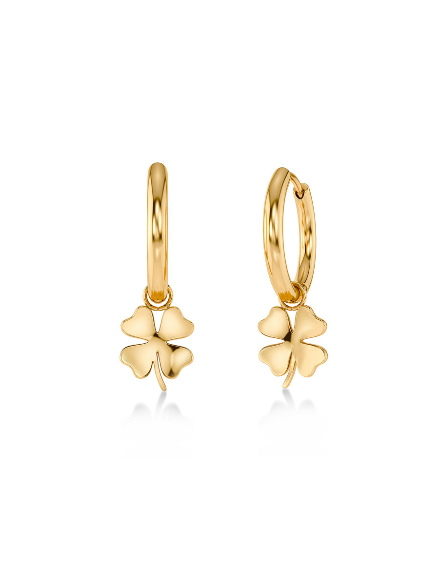 Edbladin Lucky-korvarenkaita koristaa sirot neliapilat. Valmistettu nikkelivapaasta, ruostumattomasta kirurgin teräksestä ja päällystetty 14 karaatin kultauksella.