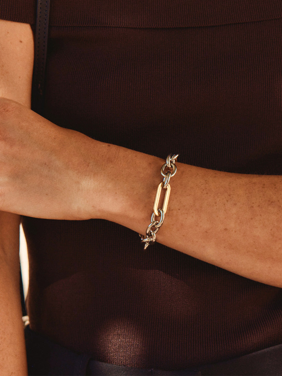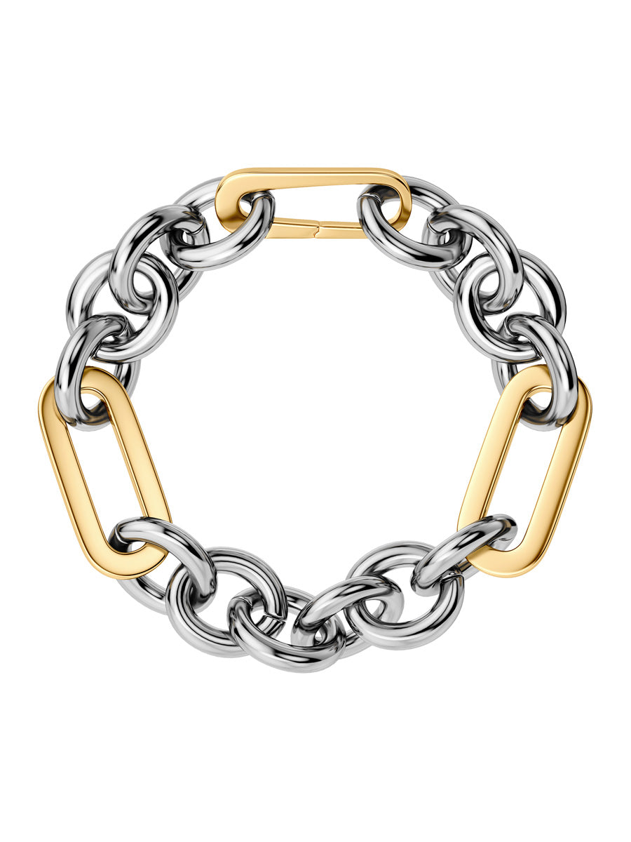 Edbladin Medley-rannekorussa isommat kullatut teräslenkit vuorottelevat pienempien kiiltävää ruostumatonta terästä olevien lenkkien kanssa. Valmistettu nikkelivapaasta, ruostumattomasta kirurgin teräksestä ja päällystetty 14 karaatin kultauksella.