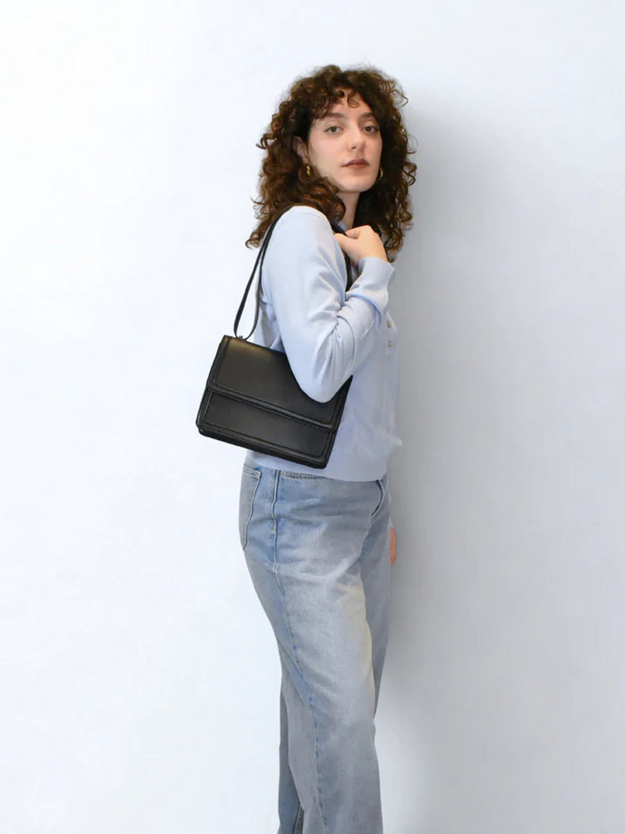 Hviskin tyylikäs käsilaukku, jossa säädettävä olkahihna. Laukussa on yksi iso osio ja pieni sisätasku. Läppä suljetaan magneettinapilla.