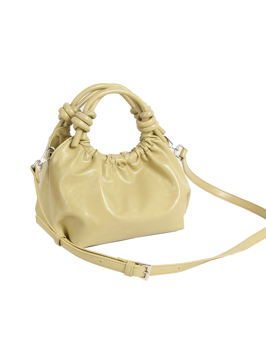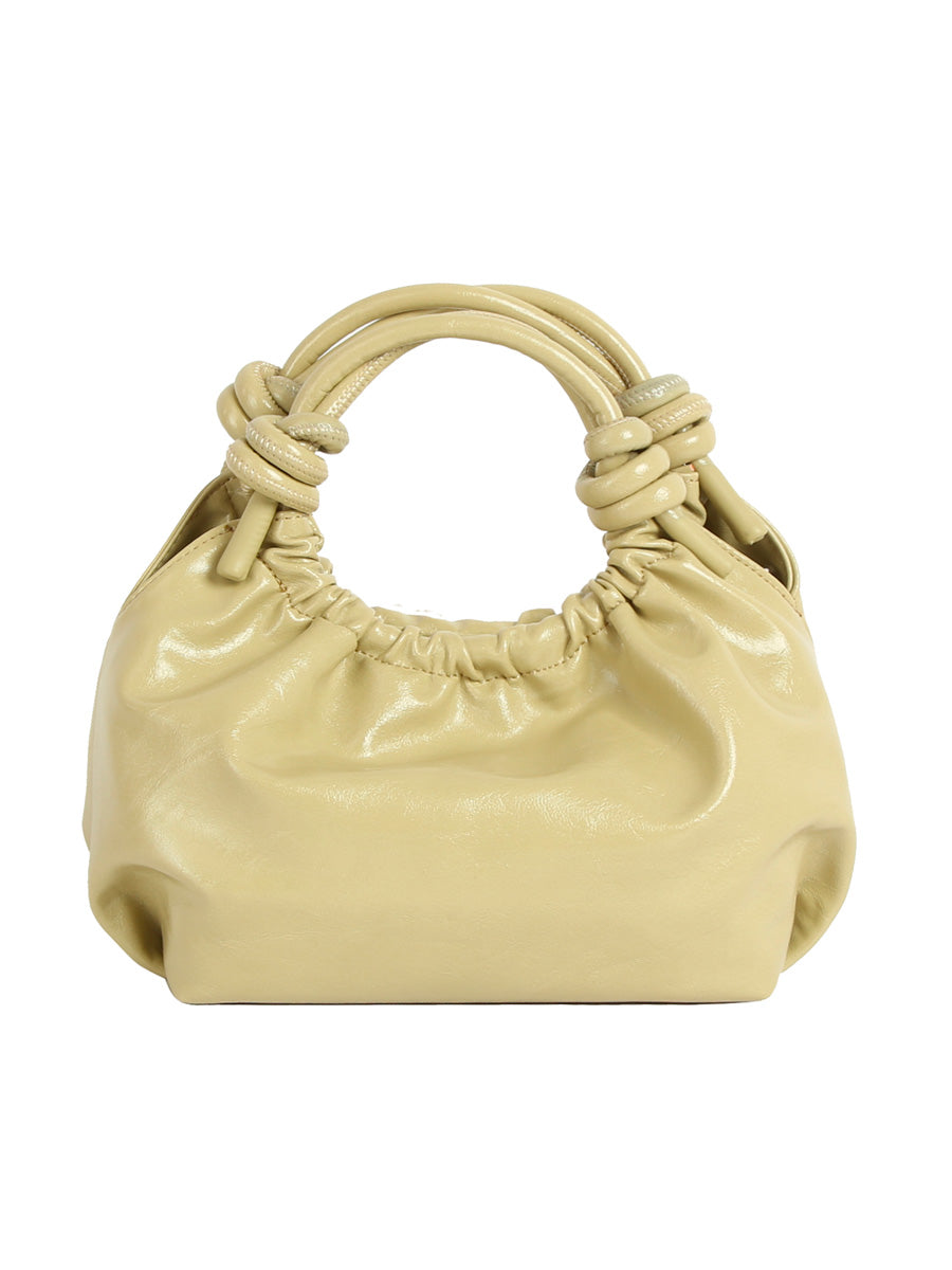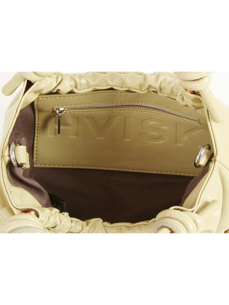 Hviskin tyylikäs pikkulaukku, jossa on magneettisuljenta ja solmuyksityiskohdat kahvoissa. Laukussa on yksi vetoketjullinen sisätasku.