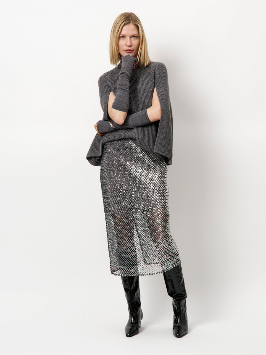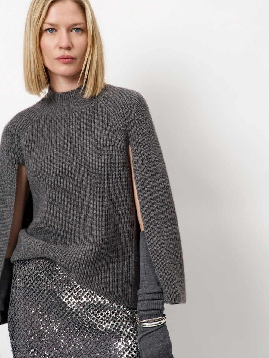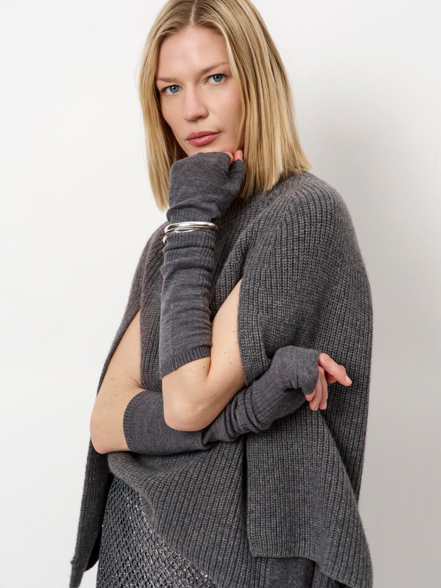 Danten Romi-neule on pehmeästä villasekoitteesta valmistettu ribbineule, joka erottuu näyttävillä viittamaisilla hihoillaan. Kerrospukeutumisen luottovaate, joka toimii tyylikkäästi esimerkiksi nahkahousujen ja sirojen nilkkureiden kanssa.