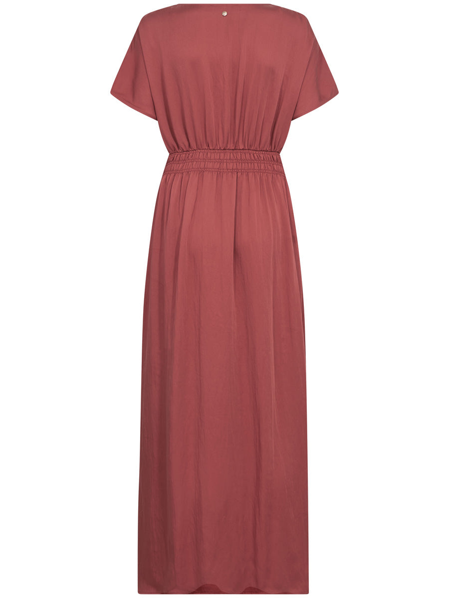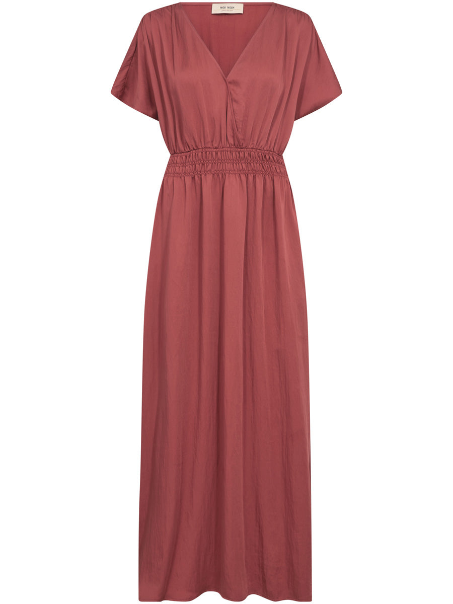 Tässä Mos Moshin mekossa on kauniisti laskeutuva, kevyt materiaali ja naisellinen siluetti. Mekossa on v-pääntie, lyhyet hihat sekä vyötäröllä joustava smokkirypytys, joka korostaa vartaloa. Pitkä, ilmava helma viimeistelee elegantin ilmeen.