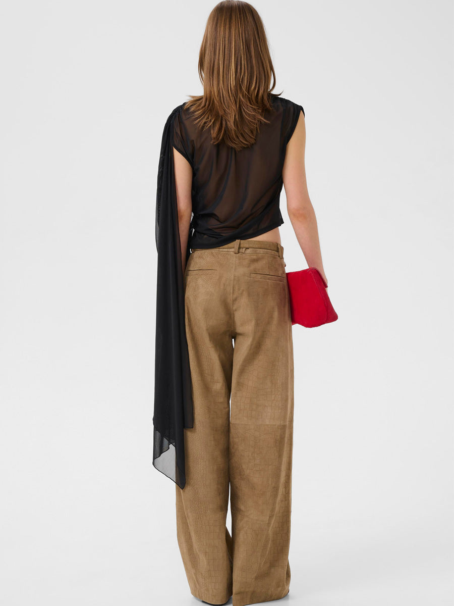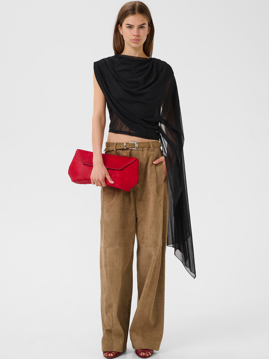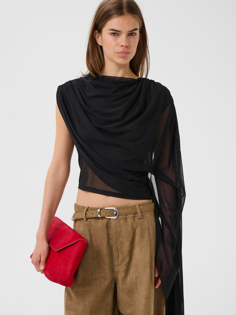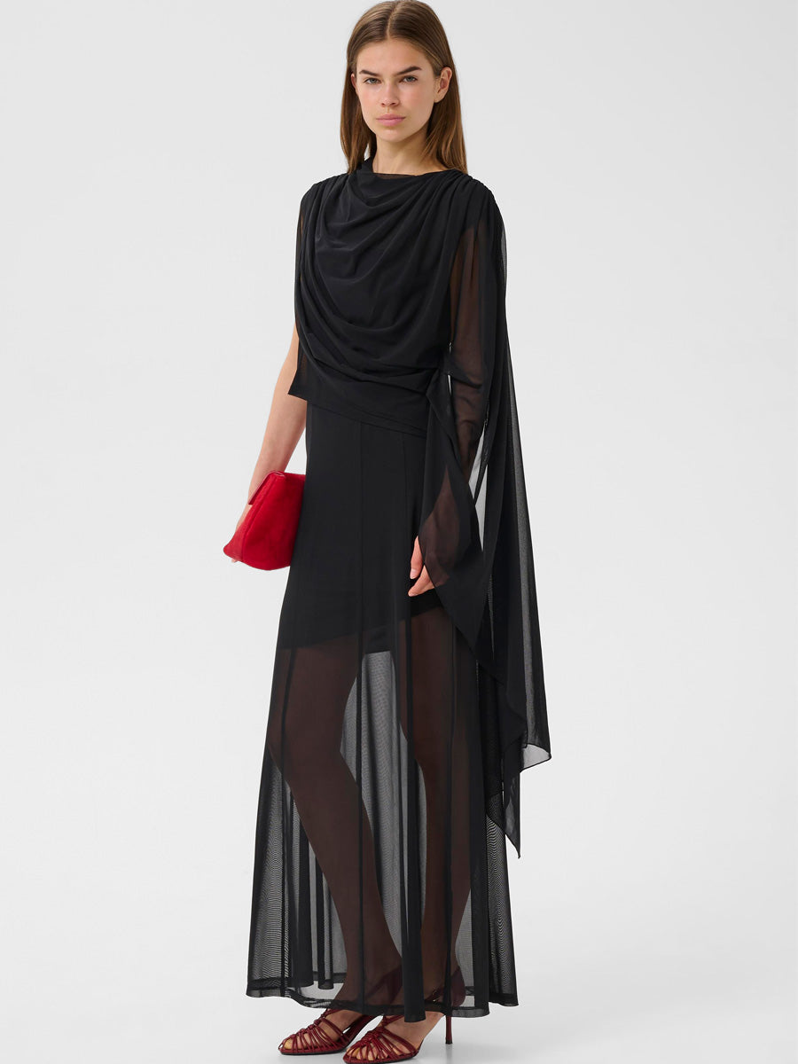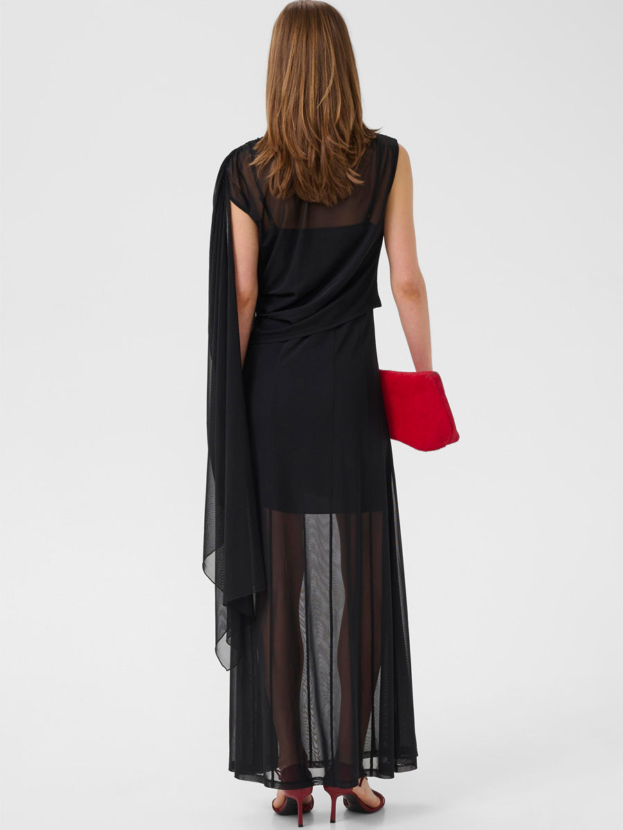 Tässä Gestuzin iltapuvussa pusero ja mekko muodostavat 2-in-1-kokonaisuuden, joten sitä voi käyttää joko näyttävänä mekkona tai erillisenä puserona. Epäsymmetrinen yhden olkapään malli ja kauniisti laskeutuva pääntie tuovat siluettiin pehmeää liikettä, ja maksipituus viimeistelee juhlavan kokonaisuuden.