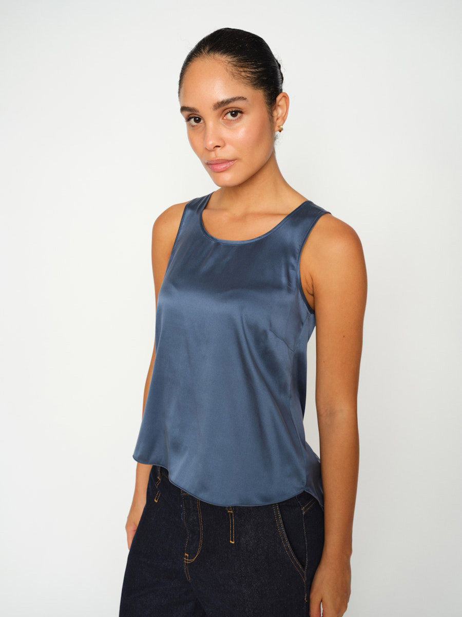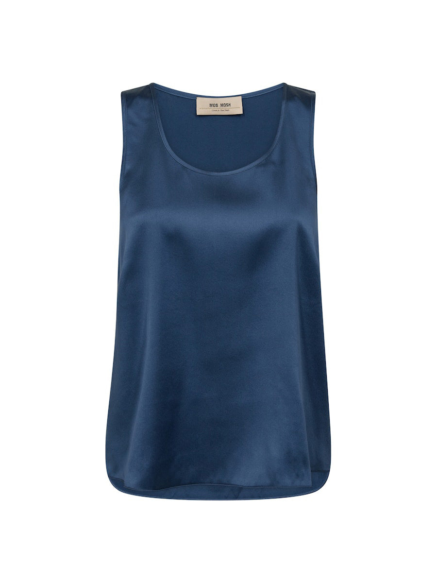 Mos Moshin ASTRID silk tank top on kaunis silkkitoppi, jossa pyöreä pääntie, pyöristetty helma ja etuosaa hieman pidempi takaosa. Rento istuvuus.
