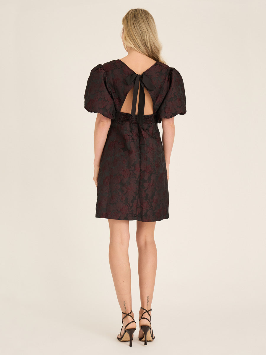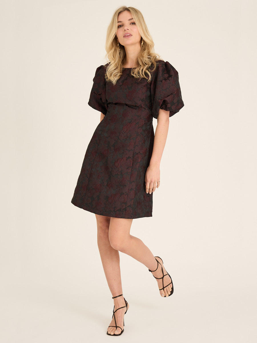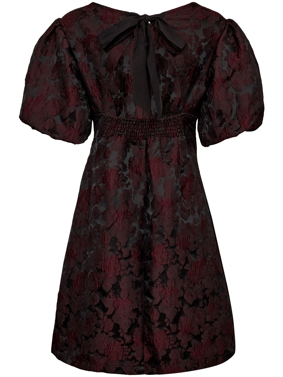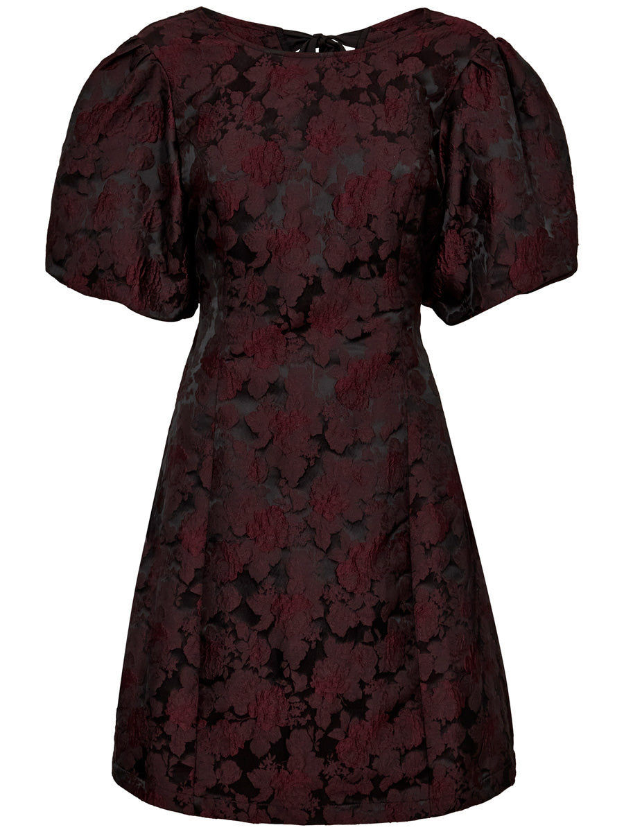 Tässä Aria-mekossa on jämäkästä jacquard-materiaalista valmistettu tyköistuva siluetti, joka korostaa vartaloa tyylikkäästi. Lyhyet puhvihihat ja pyöreä pääntie tuovat asuun pehmeyttä, kun taas selän siro leikkaus ja rusetti lisäävät naisellista yksityiskohtaisuutta. Lyhyt pituus tekee mekosta näyttävän valinnan juhliin ja iltatilaisuuksiin.
