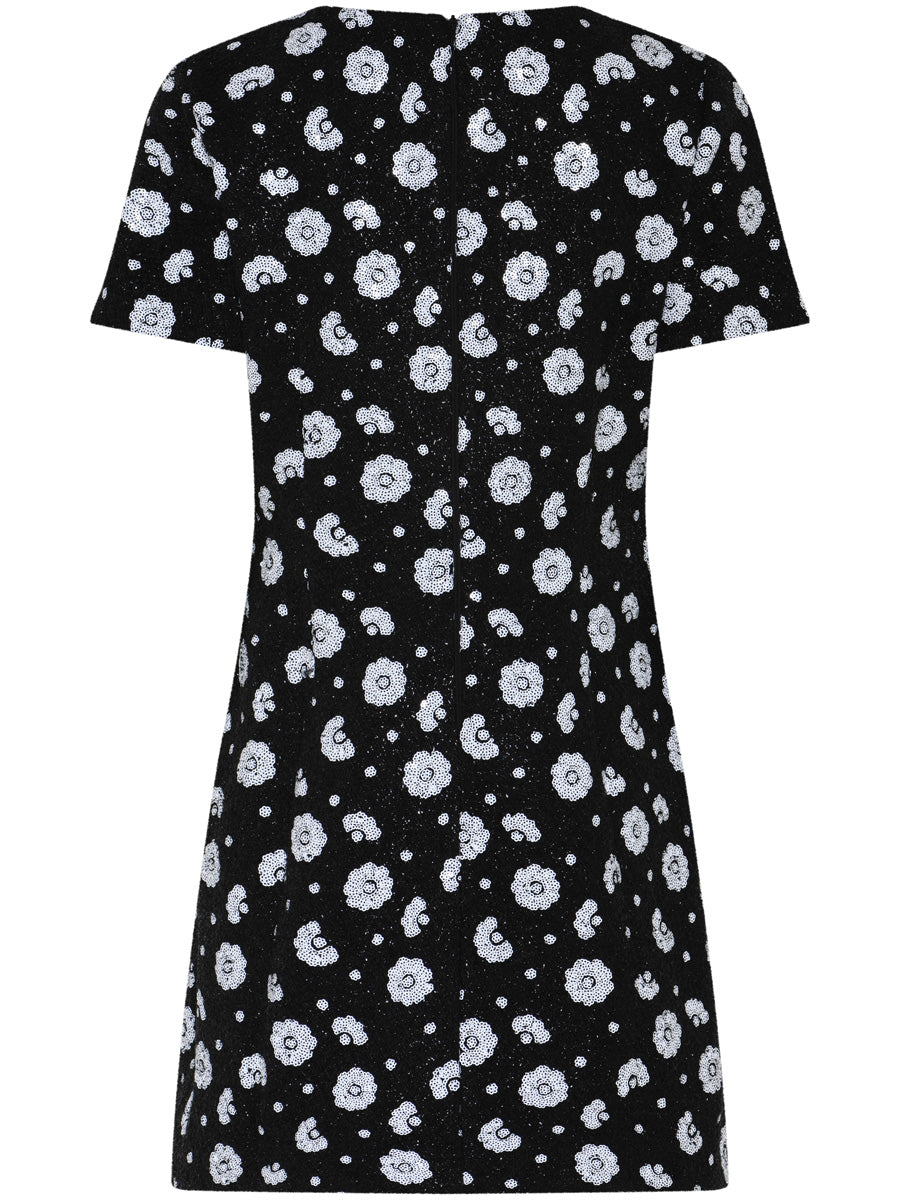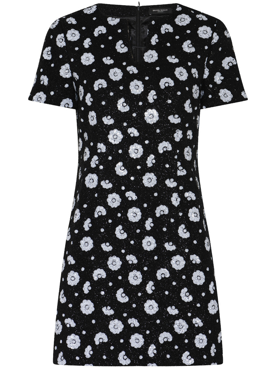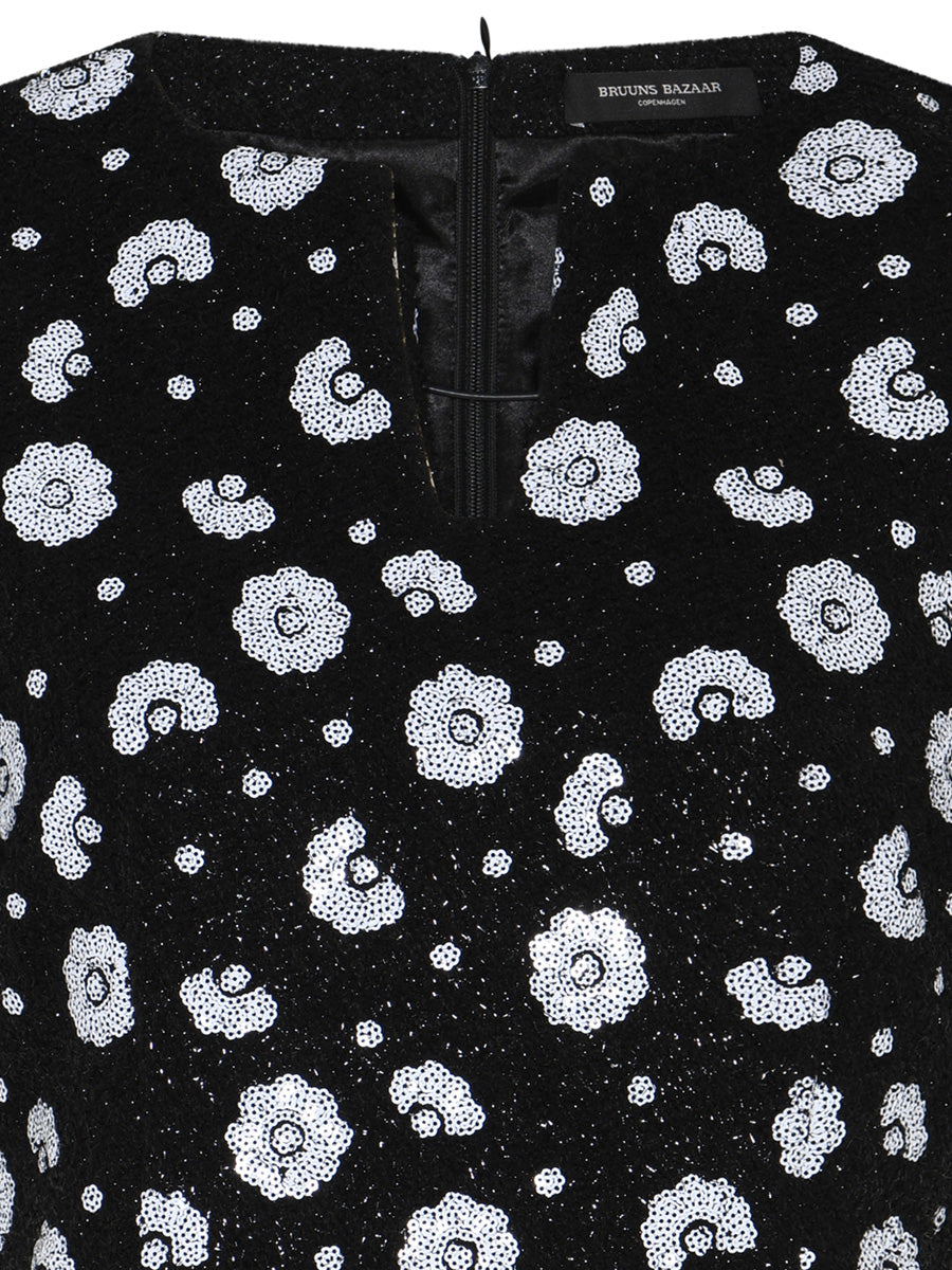 Tässä Bruuns Bazaarin mekossa yhdistyvät säihke ja itsevarma tyyli. Kukkakuvioidut paljetit peittävät koko pinnan, ja suora leikkaus sekä lyhyet hihat tekevät ilmeestä kevyen. Mekko on näyttävä valinta juhliin – se toimii yhtä hyvin korkokenkien ja korujen kanssa kuin sukkahousujen ja nilkkureiden parina rennommassa iltatyylissä.