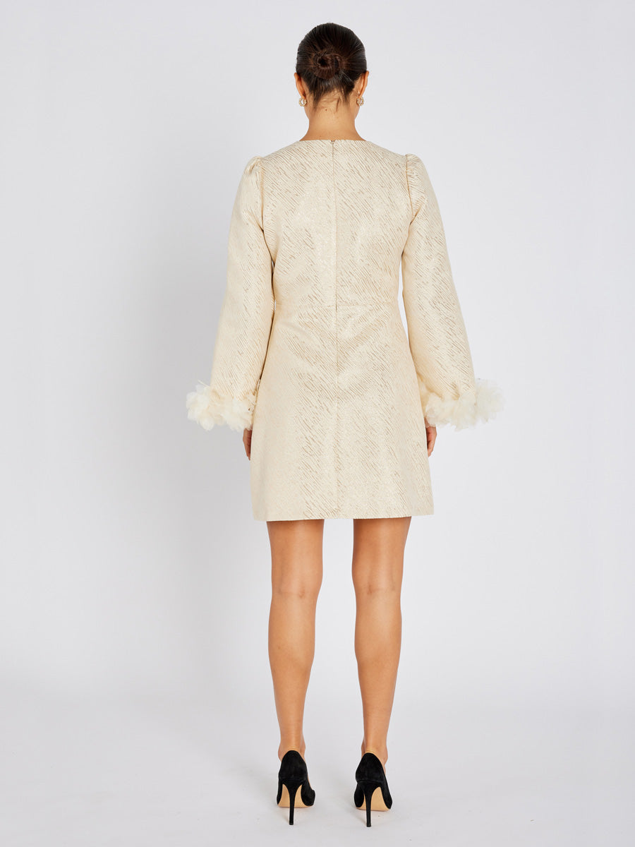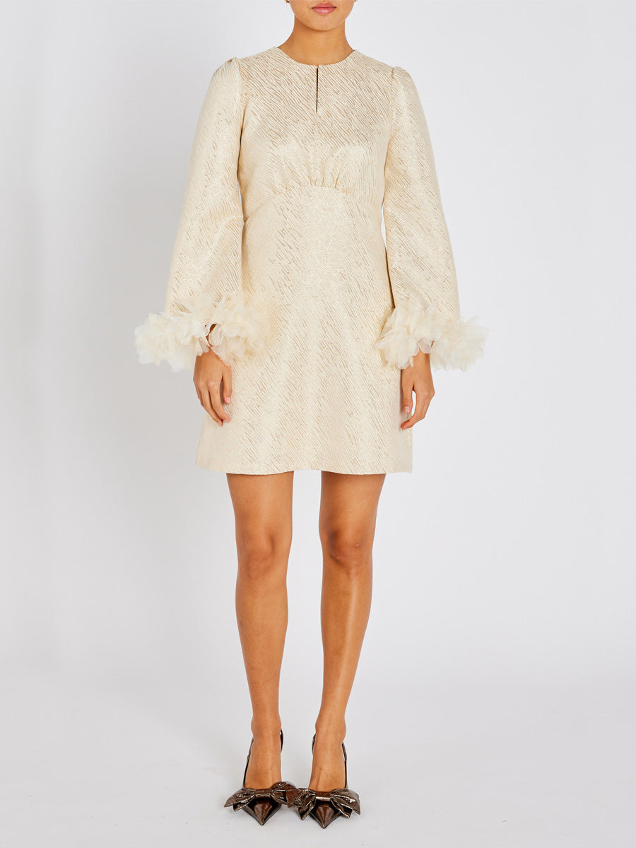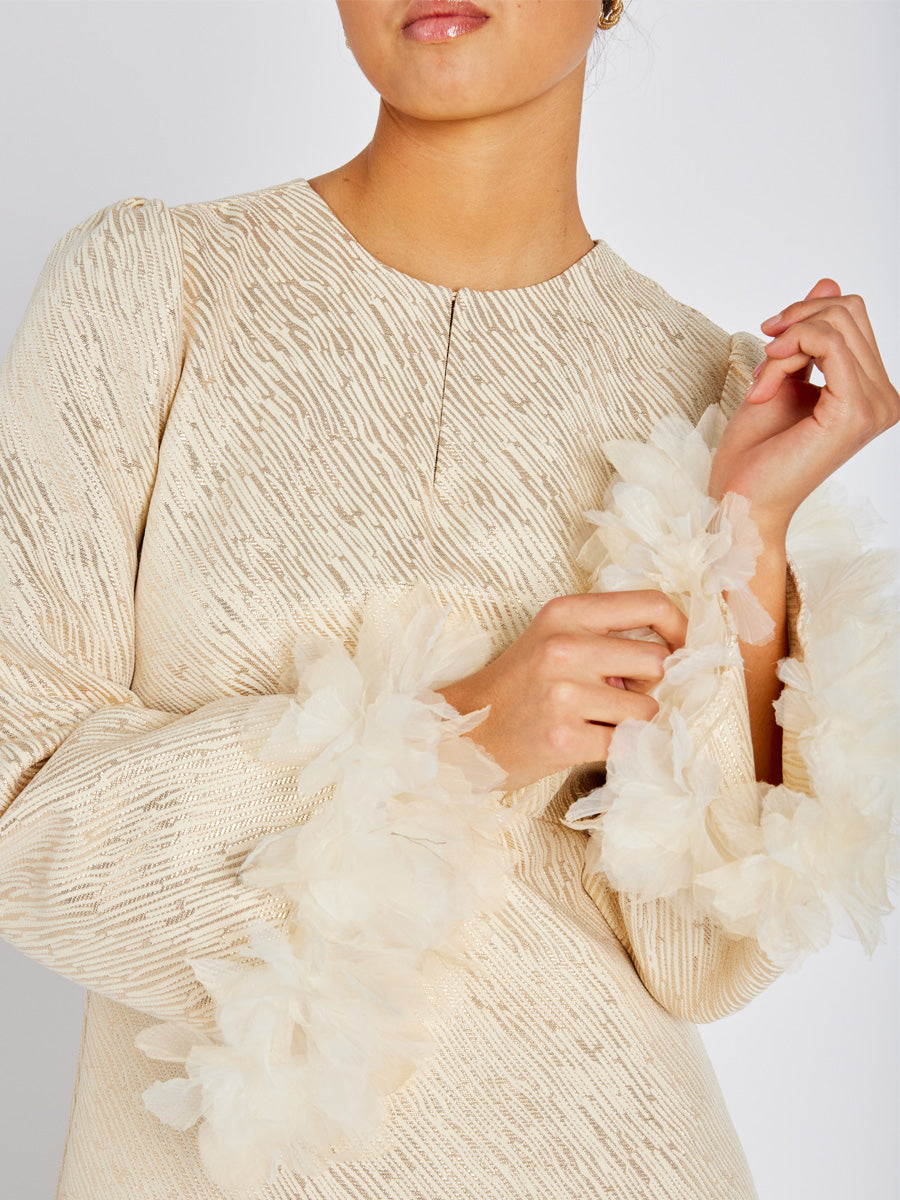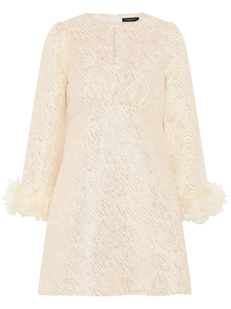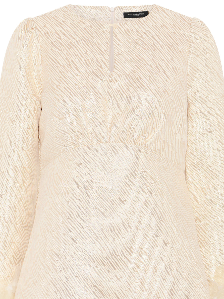 Tässä Bruuns Bazaarin mekossa on juhlan tuntu jokaisessa yksityiskohdassa. Kiiltävä kangas ja hihansuiden höyhenkoristeet tekevät siitä näyttävän ja ylellisen valinnan erityisiin hetkiin. Mekko toimii täydellisesti korkokenkien ja pienen laukun kanssa iltamenoissa. Tyylikäs kokonaisuus, jossa on ripaus glamouria.
