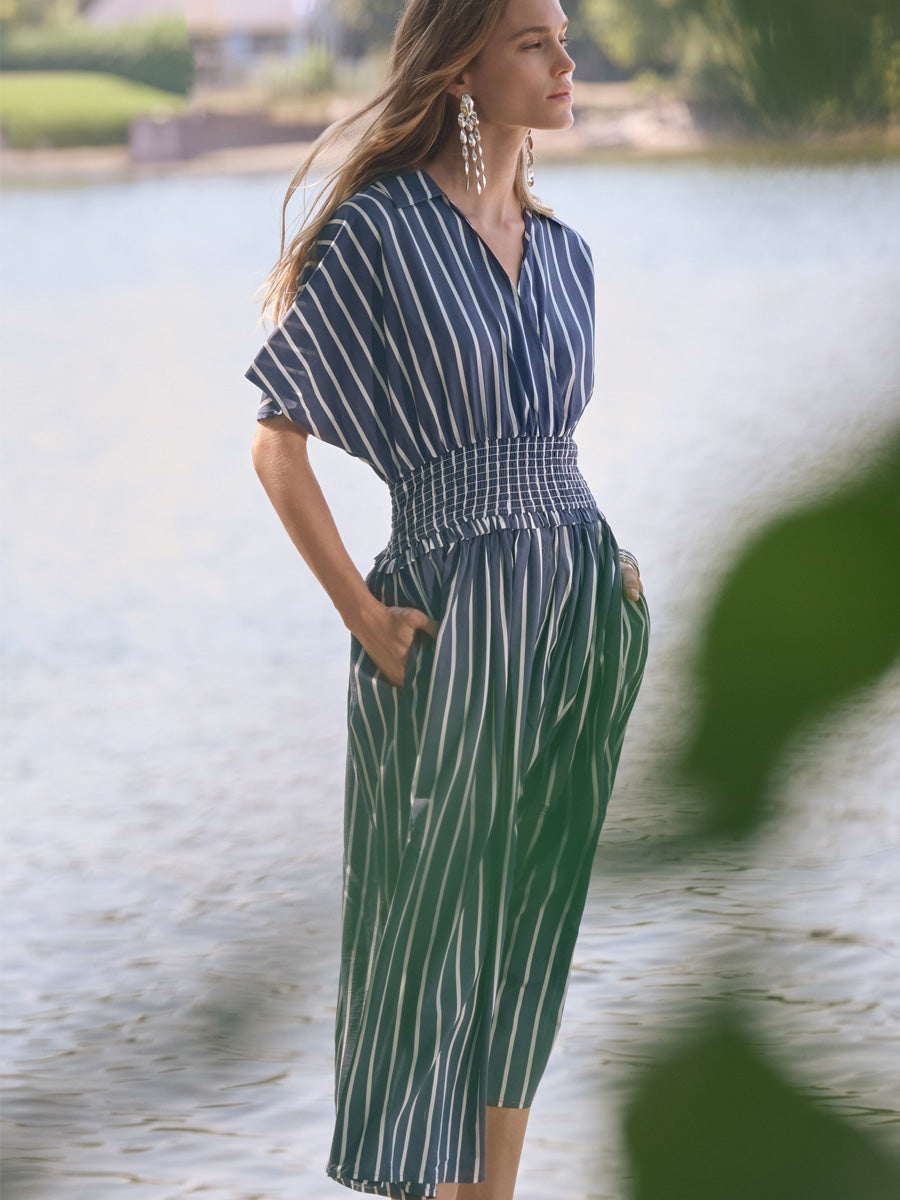 Tässä Joseph Ribkoffin mekossa lankavärjätyt raidat tuovat kankaaseen syvyyttä. Kietaisupääntie ja paitakaulus yhdistyvät imartelevaan fit & flare -siluettiin, kun taas joustava vyötärö ja lyhyet dolmain-hihat viimeistelevät huolitellun mutta vaivattoman kokonaisuuden.