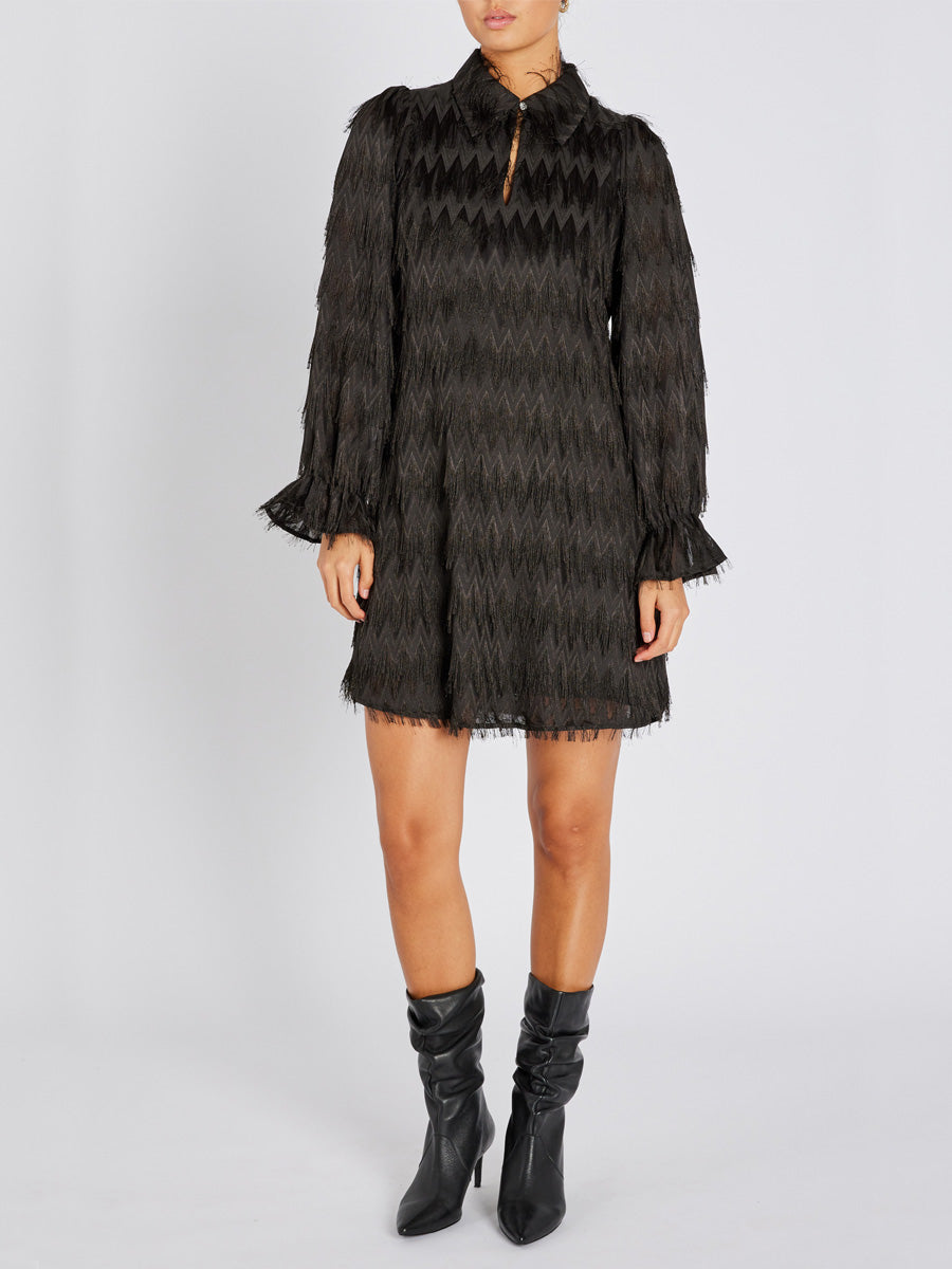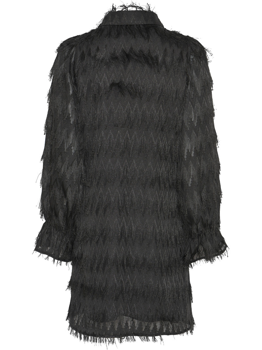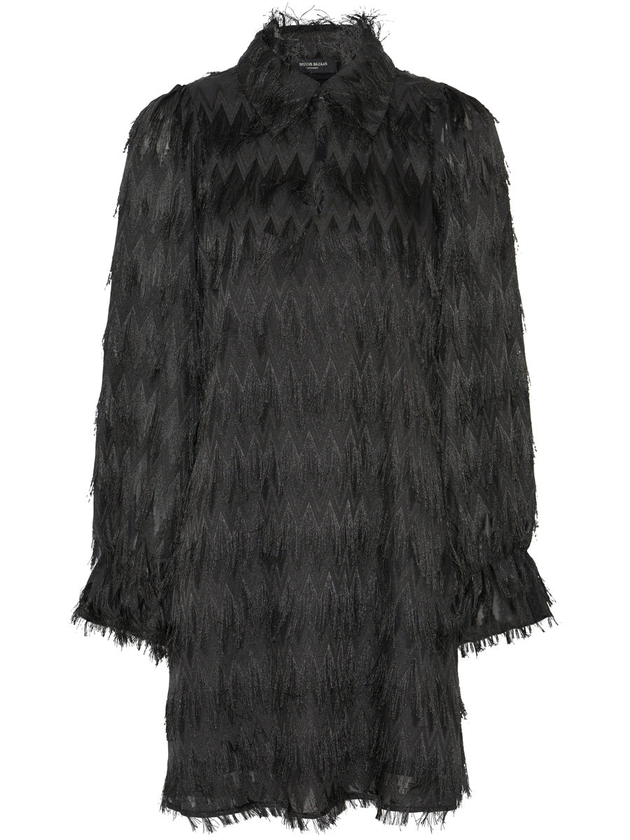 Tässä Bruuns Bazaarin hapsumekossa on ajaton ja naisellinen ilme. Kevyesti a-linjainen leikkaus laskeutuu kauniisti, ja kauluksen koristeellinen nappi lisää hillittyä näyttävyyttä. Pehmeä vuoritus tekee mekosta miellyttävän päällä ja antaa sille ylellisen viimeistelyn. Sopii yhtä hyvin juhlaan korkokenkien kanssa kuin arkeen bleiserin ja saappaiden pariksi.
