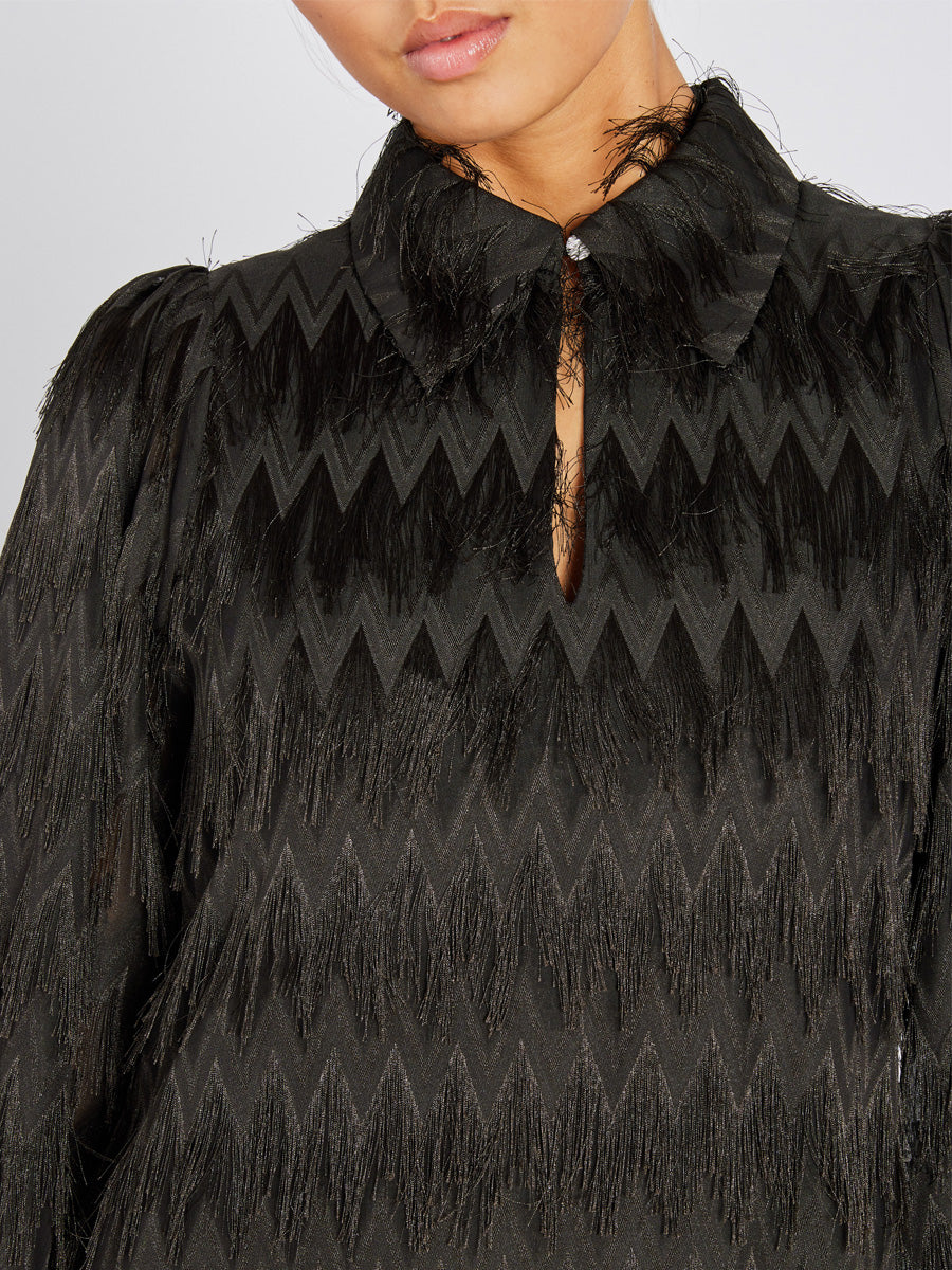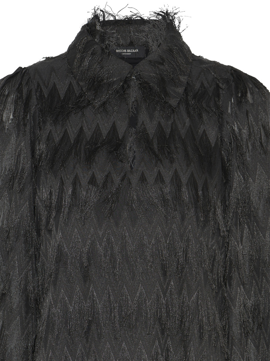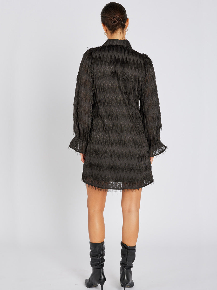 Tässä Bruuns Bazaarin hapsumekossa on ajaton ja naisellinen ilme. Kevyesti a-linjainen leikkaus laskeutuu kauniisti, ja kauluksen koristeellinen nappi lisää hillittyä näyttävyyttä. Pehmeä vuoritus tekee mekosta miellyttävän päällä ja antaa sille ylellisen viimeistelyn. Sopii yhtä hyvin juhlaan korkokenkien kanssa kuin arkeen bleiserin ja saappaiden pariksi.