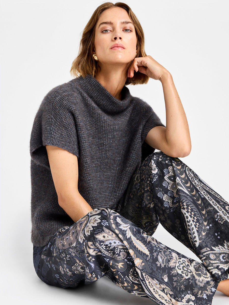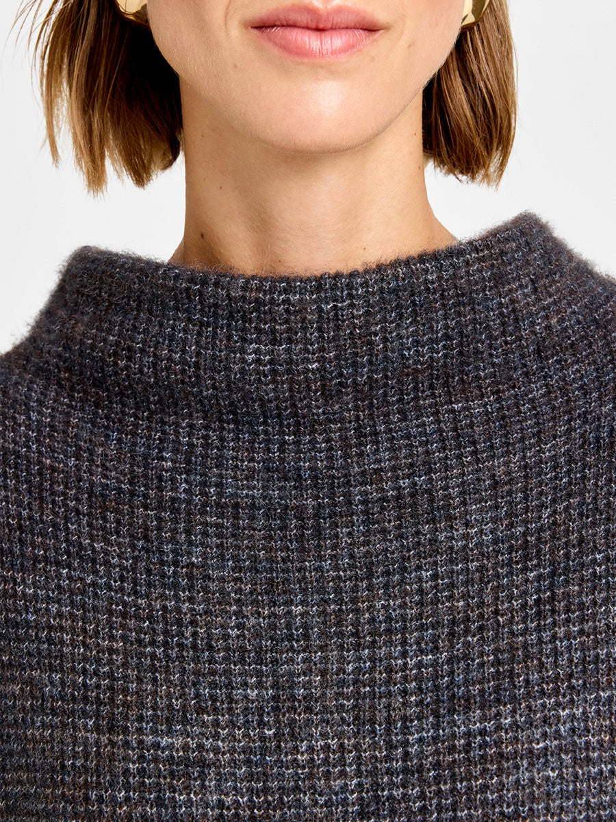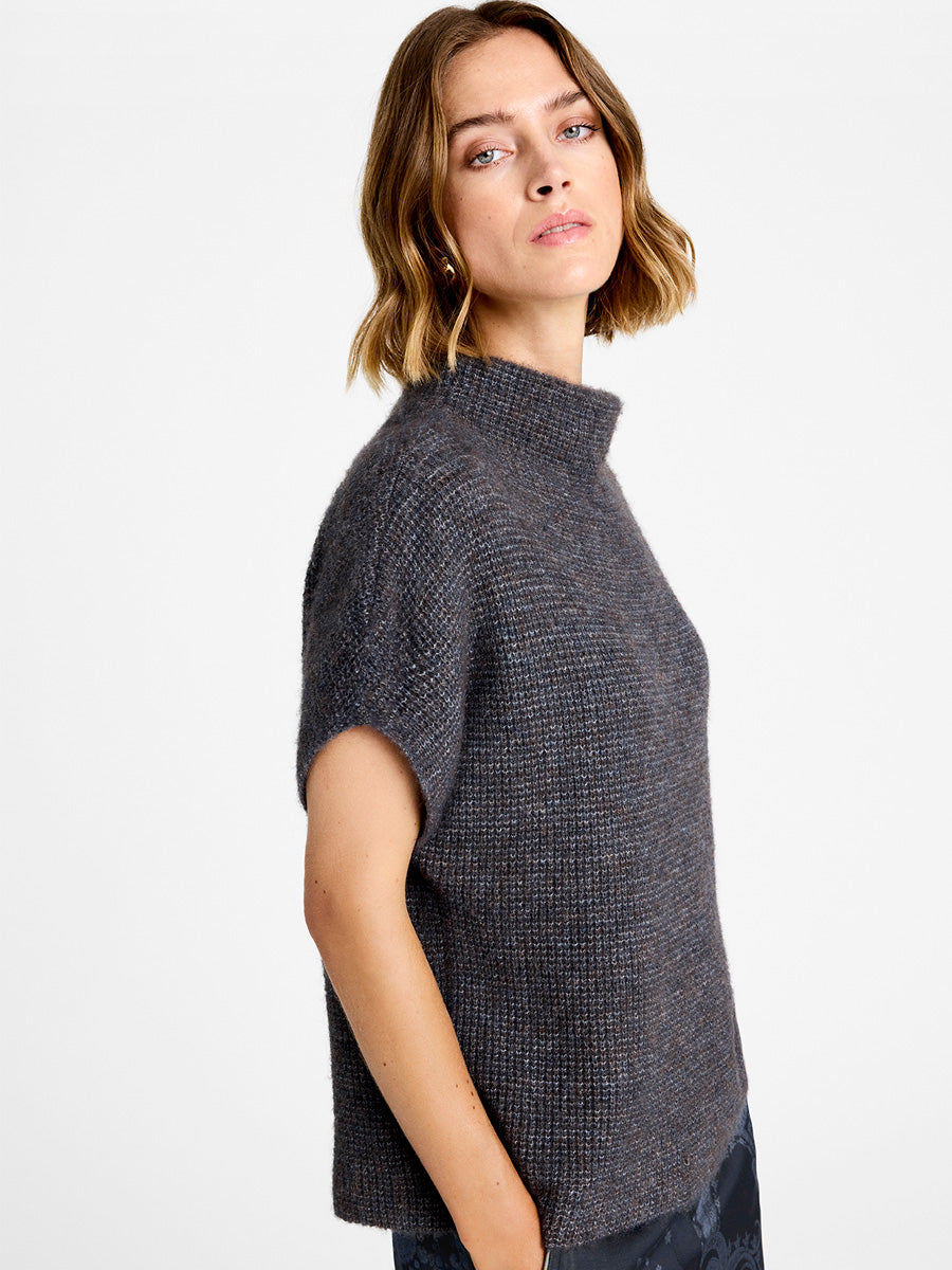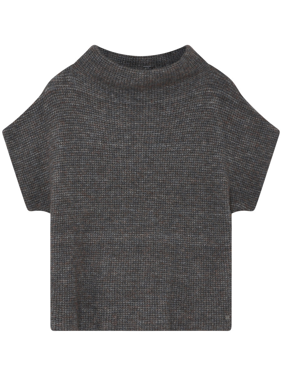 Gustavin COYA knit cape kauniissa tummanruskeassa sävyssä. Pehmeässä neuleessa on lyhyet hihat ja korkeahko kaulus. Käytä sellaisenaan tai pitkähihaisen paidan päällä.