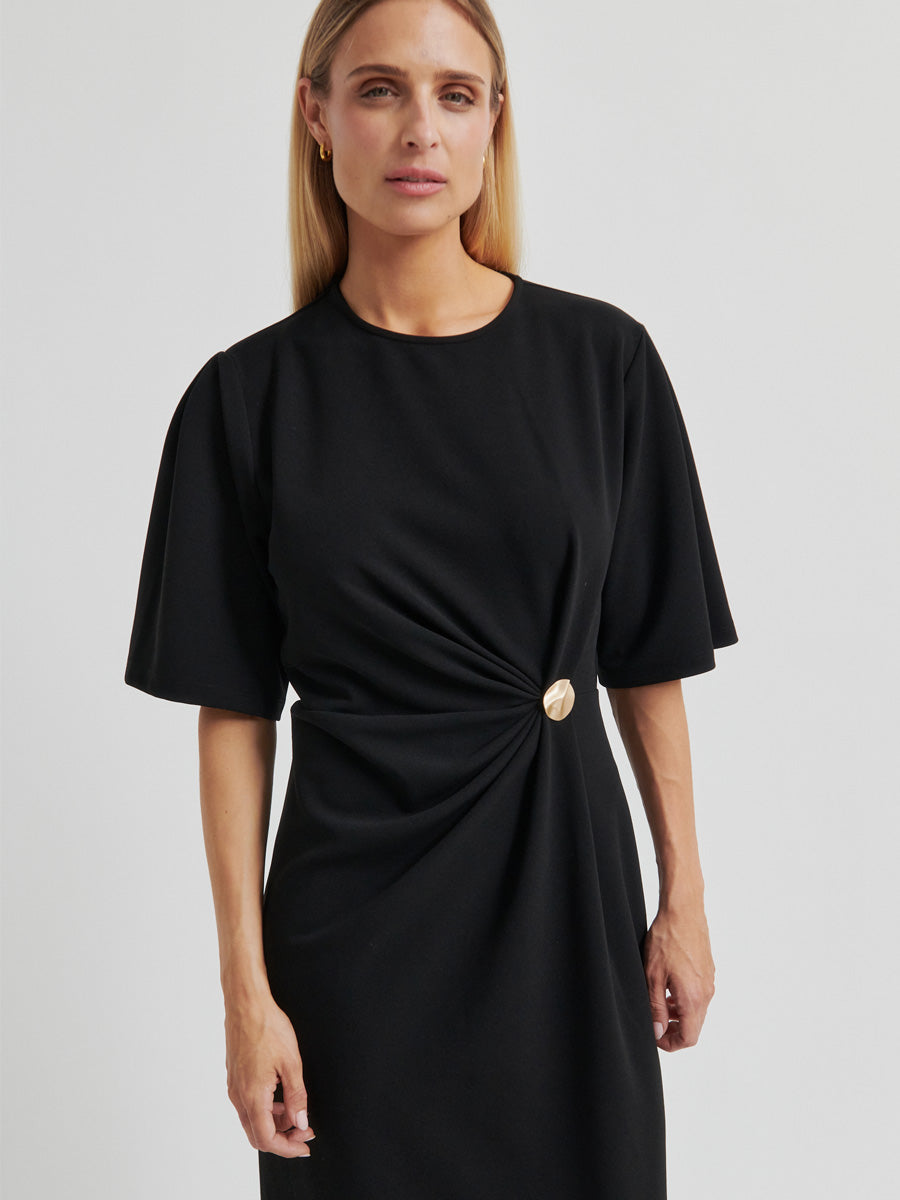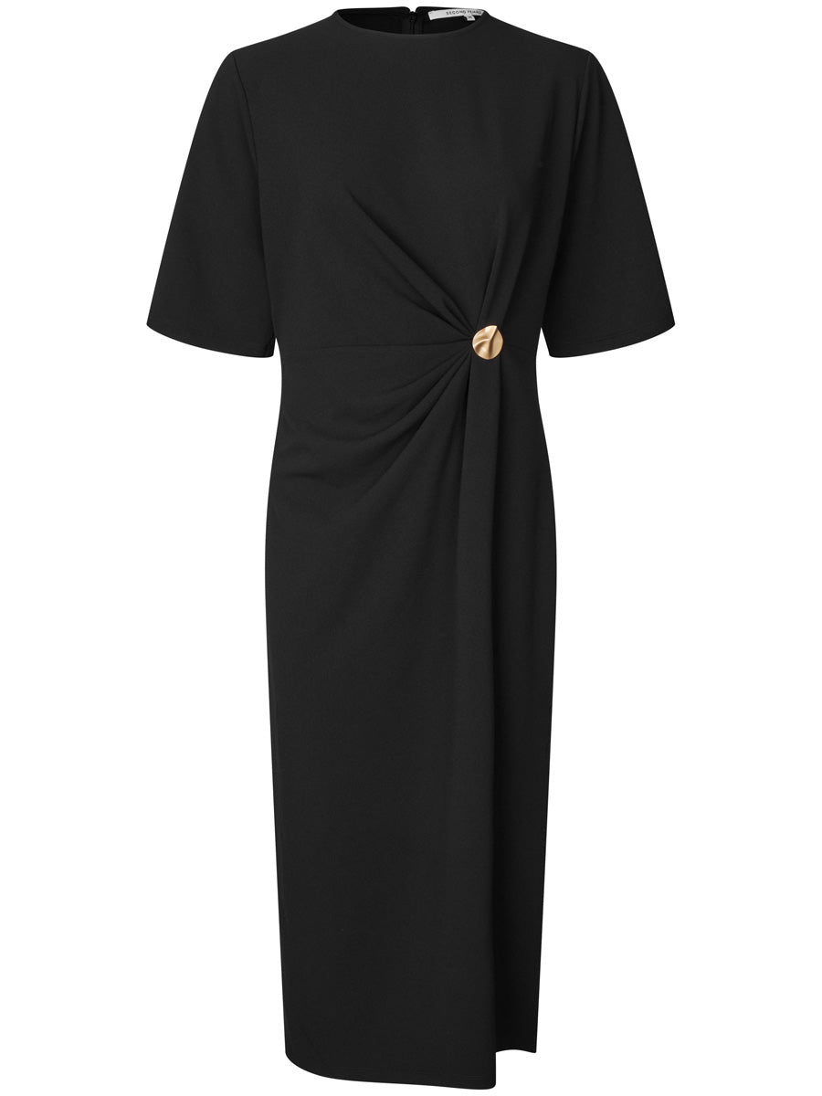 Tässä Second Femalen mekossa on pehmeä ja kevyesti joustava materiaali, joka laskeutuu kauniisti vartalon myötäisesti. Vyötärön kullanvärinen yksityiskohta ja rypytys korostavat naisellista siluettia, kun taas sivuhalkio tuo asuun keveyttä ja liikettä. Tyylikäs valinta niin juhlaan kuin illanviettoon.