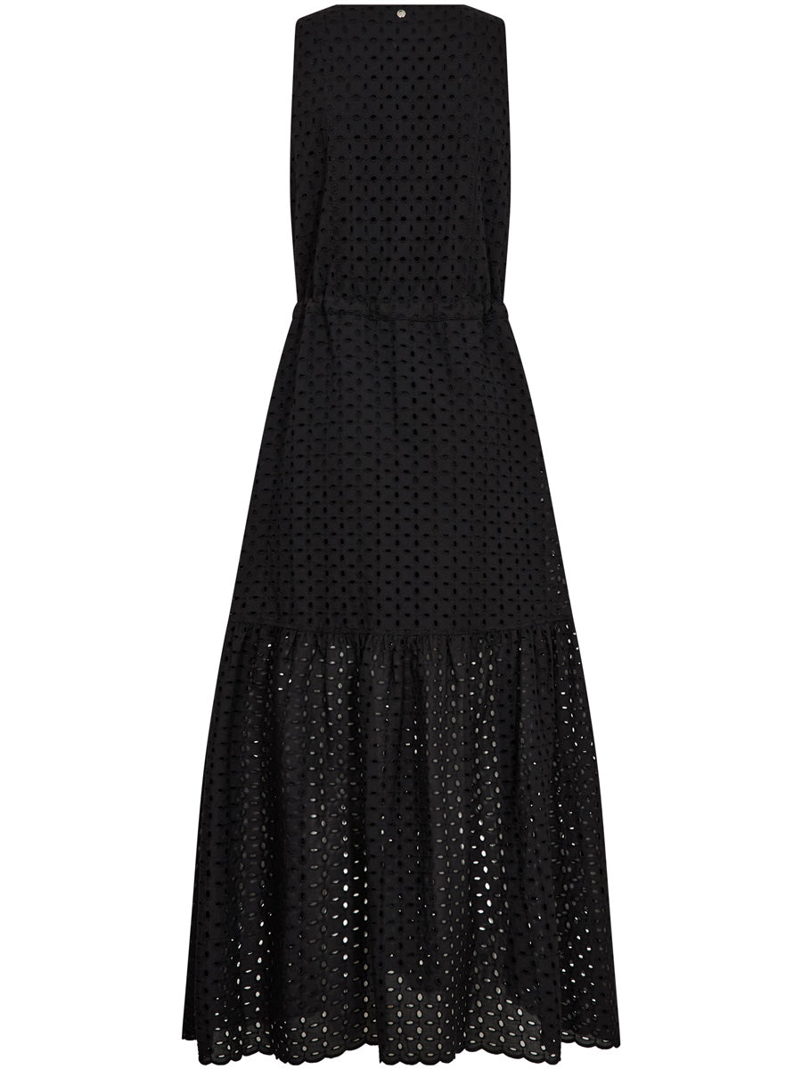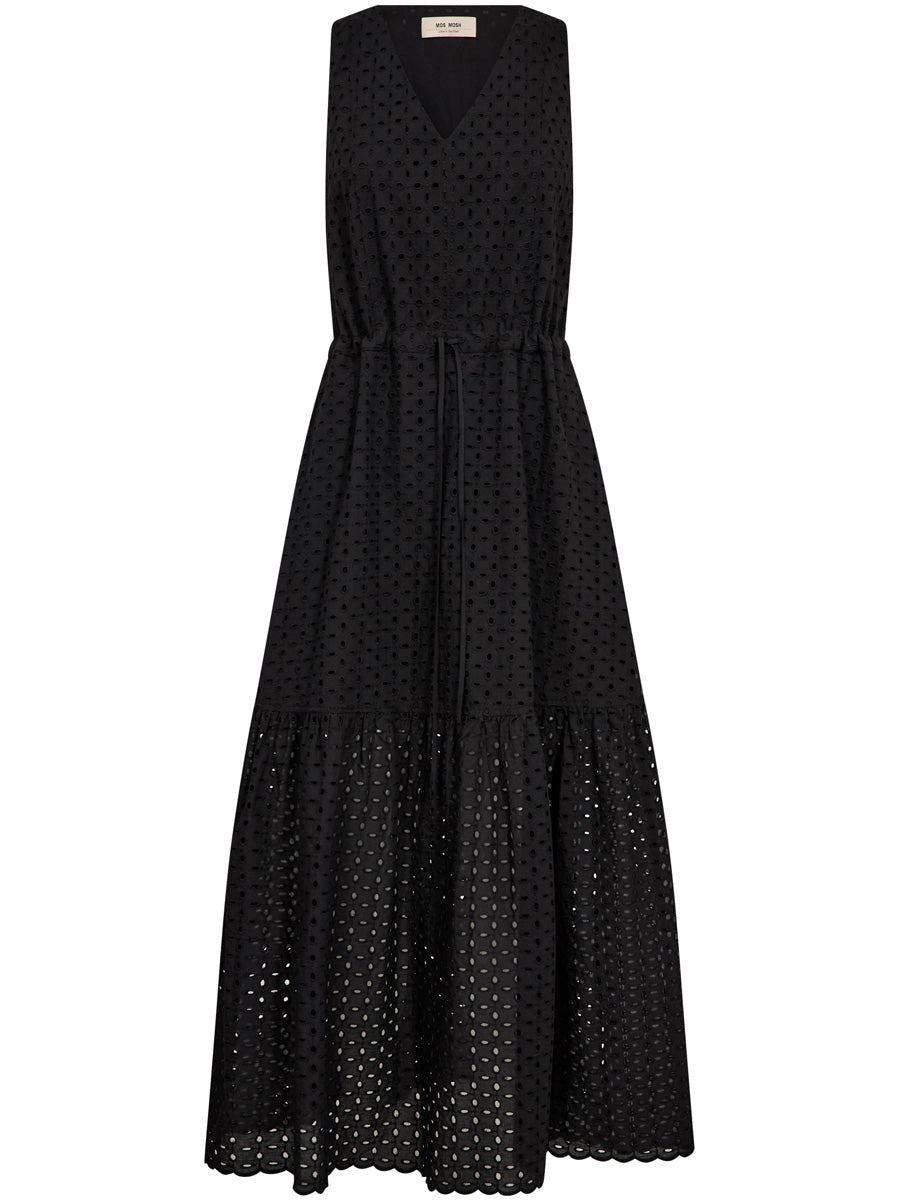 Tässä Mos Moshin mekossa on kaunis brodeerattu materiaali, joka tuo ilmeeseen keveyttä ja tekstuuria. Hihattomassa mallissa on v-pääntie sekä vyötäröllä kiristettävä nyöri, jolla saat istuvuuden säädettyä mieleiseksesi. Pitkä helma ja kevyesti läpikuultava alaosa viimeistelevät ilmavan ja elegantin kokonaisuuden.