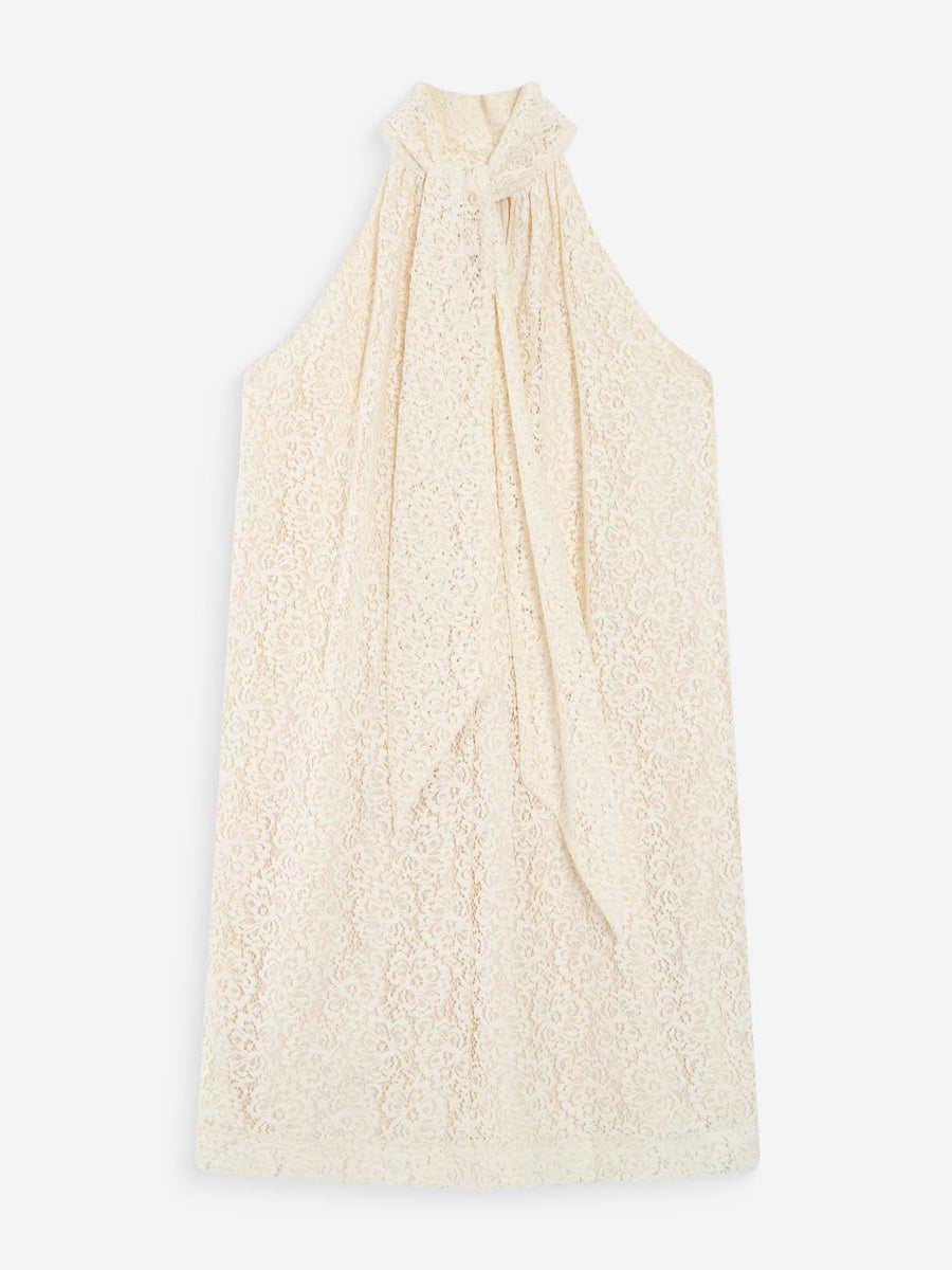 Tässä Grace & Milan mekossa on korkea pääntie, joka solmitaan kauniisti niskan taakse. Pääntien kevyet laskokset ja selän pieni avonainen yksityiskohta tuovat mekkoon pehmeää ilmettä ja korostavat naisellista siluettia. Lyhyt pitsimekko sopii täydellisesti juhlavampiin hetkiin.