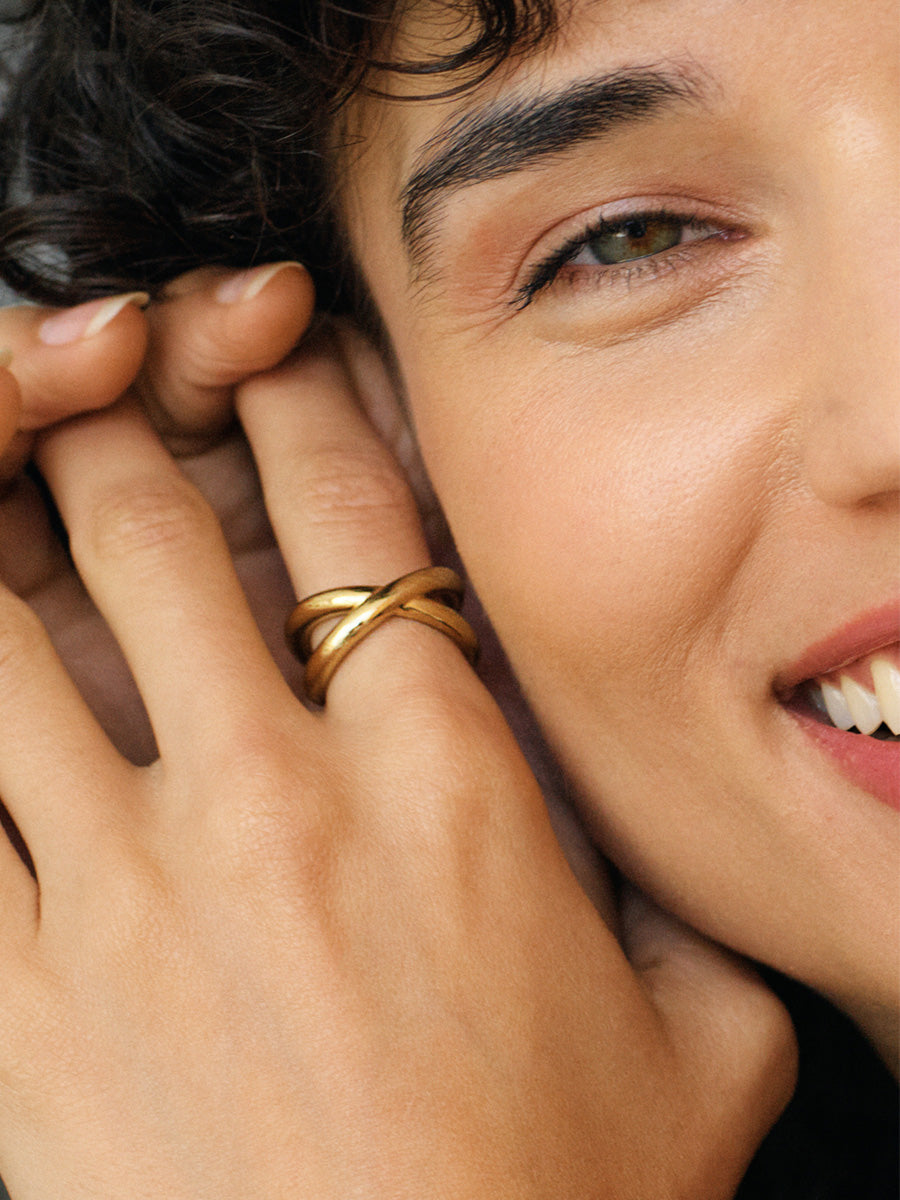 Edbladin elegantti Alexa-sormus. Valmistettu nikkelivapaasta, ruostumattomasta kirurgin teräksestä ja päällystetty 14 karaatin kultauksella.
