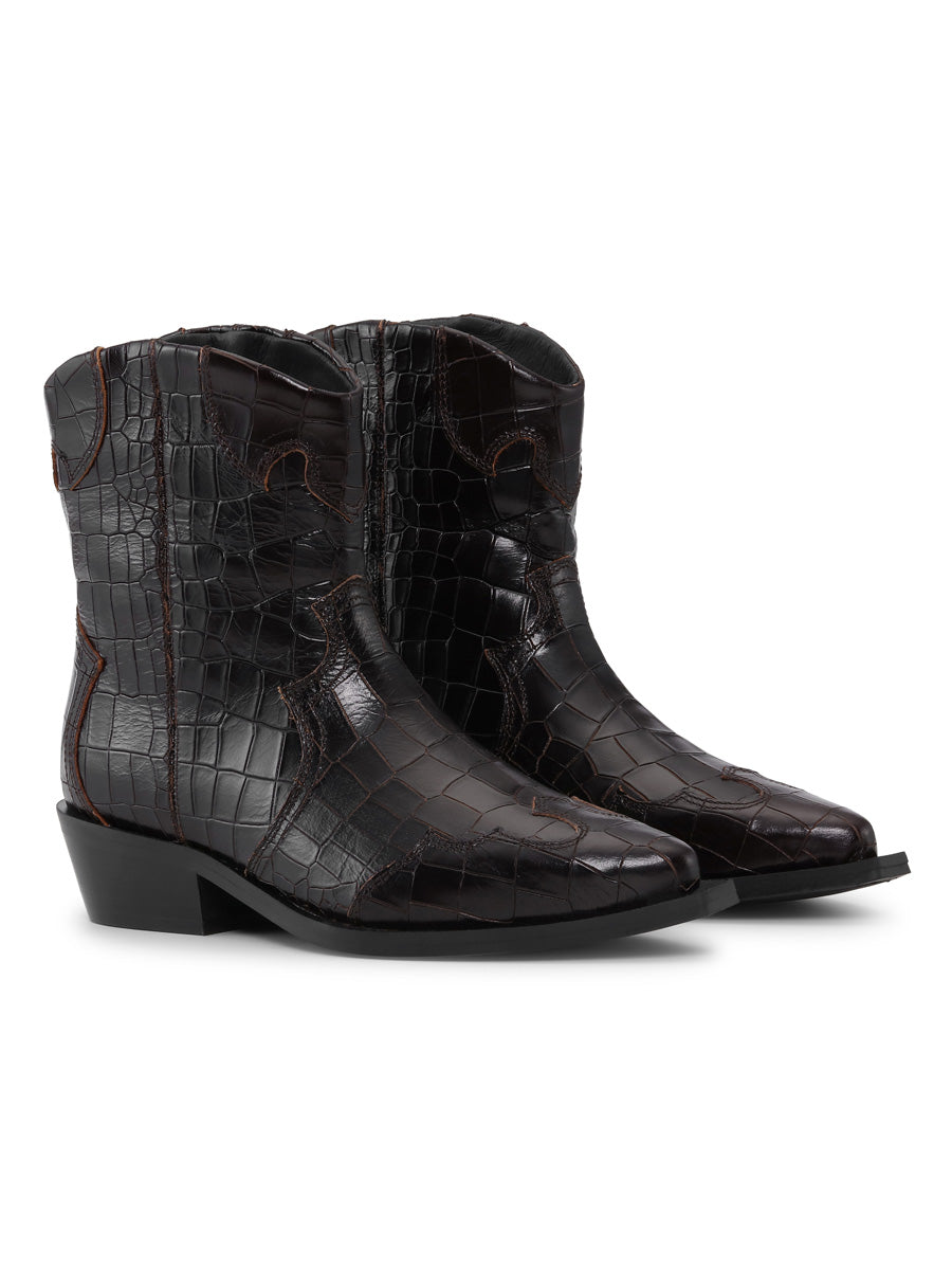 Nämä Shoe Biz Copenhagenin Dania-nilkkurit tuovat western-henkistä asennetta asuun. Croco-teksturoitu nahka, kapea kärki ja matala korko tekevät kengistä näyttävät mutta helposti yhdisteltävät.