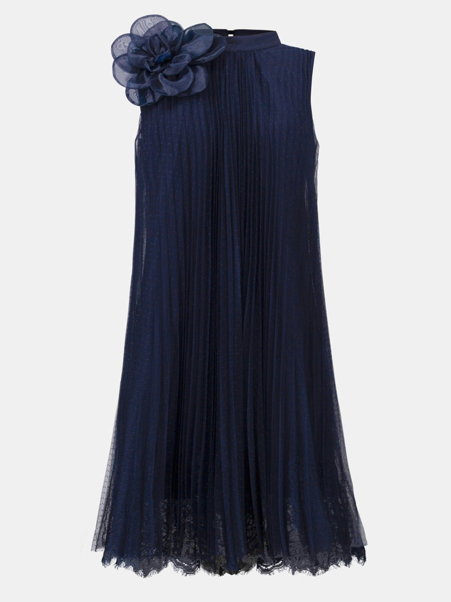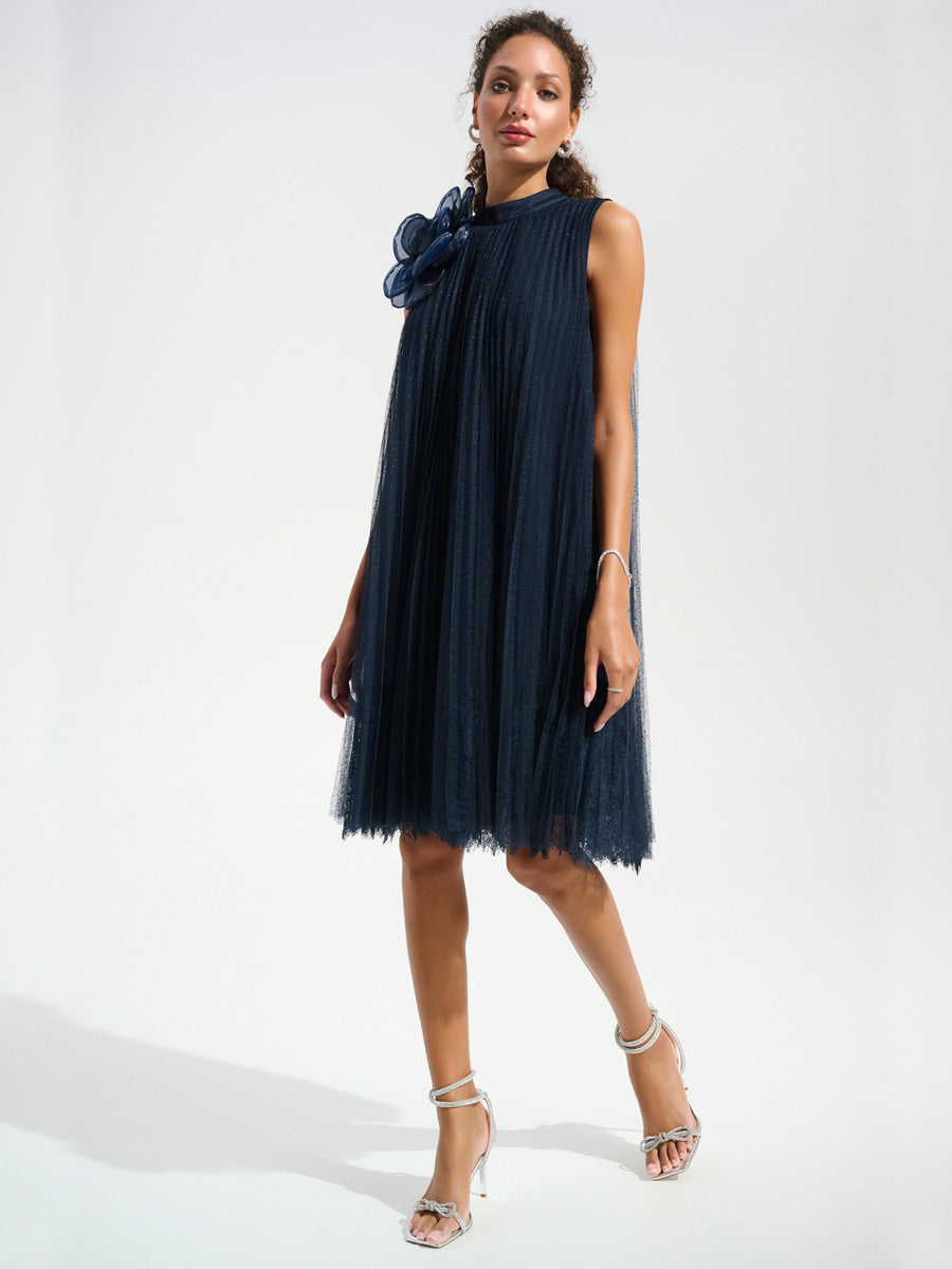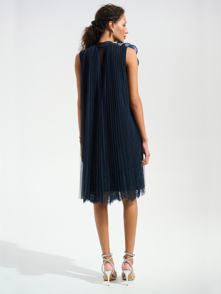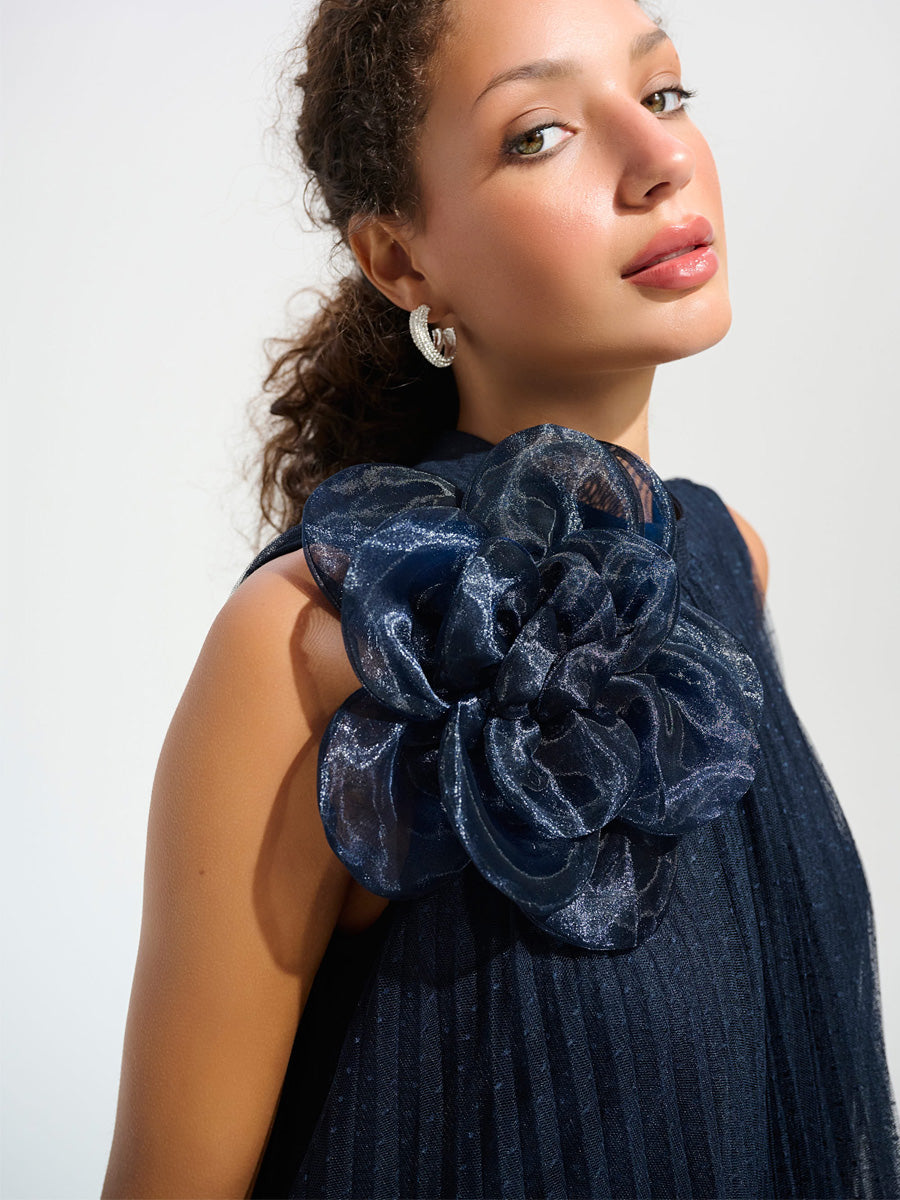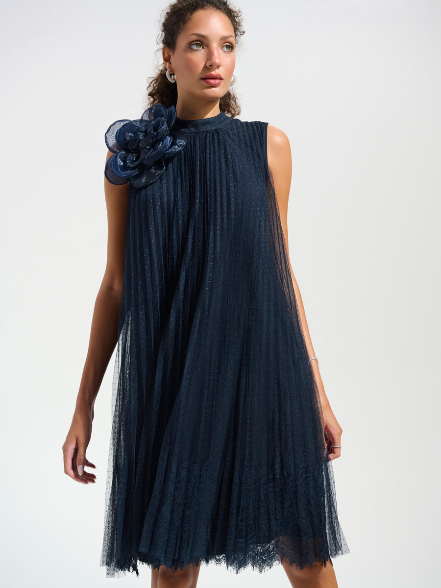 Tässä Joseph Ribkoffin a-linjaisessa mekossa yhdistyvät herkkyys ja hienostuneisuus. Kevyt, läpikuultava pilkkumesh ja pitsireunainen helma liikkuvat kauniisti jokaisella askeleella. Pääntietä koristaa pehmeä puolikorkea kaulus ja näyttävä organzakukka, jotka tuovat asuun romanttisen viimeistelyn. Polvipituinen malli sopii erinomaisesti juhliin, joissa haluat näyttää tyylikkäältä.