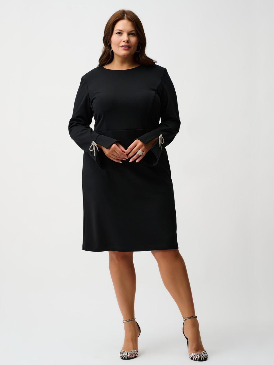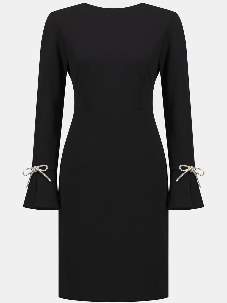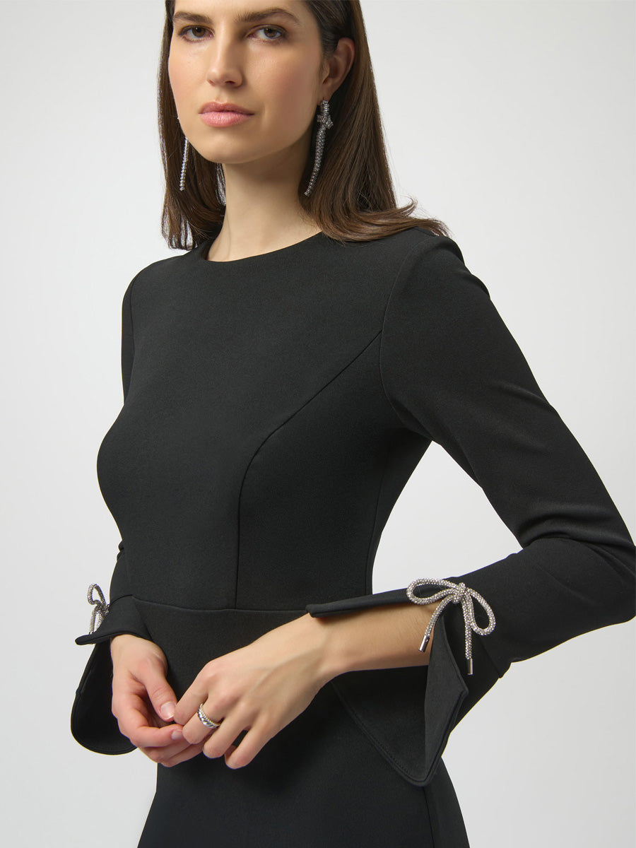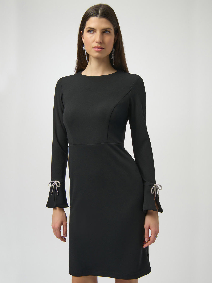 Tämä Joseph Ribkoffin mekko korostaa siluettia kauniisti suoralinjaisella leikkauksellaan. Pyöreä pääntie ja pitkät hihat rusettiyksityiskohtineen tuovat asuun viimeistellyn ilmeen, mikä tekee mekosta monikäyttöisen valinnan erilaisiin tilaisuuksiin. Malli on 175 cm pitkä ja päällään koko 34.