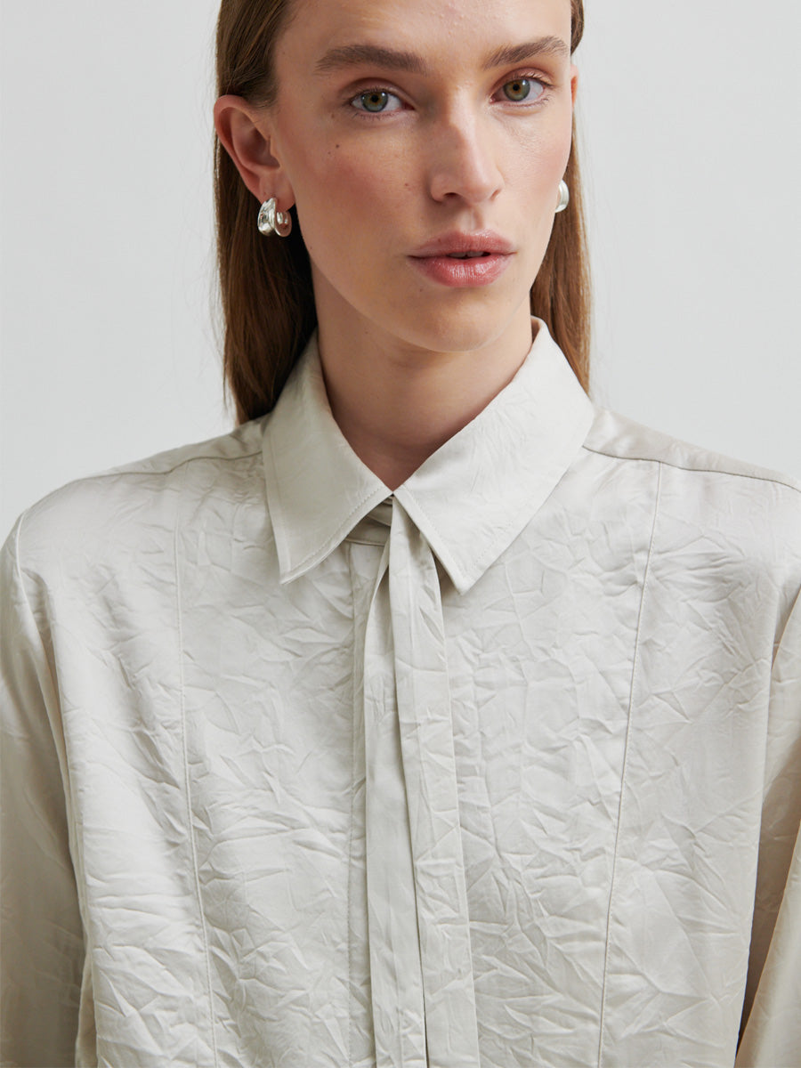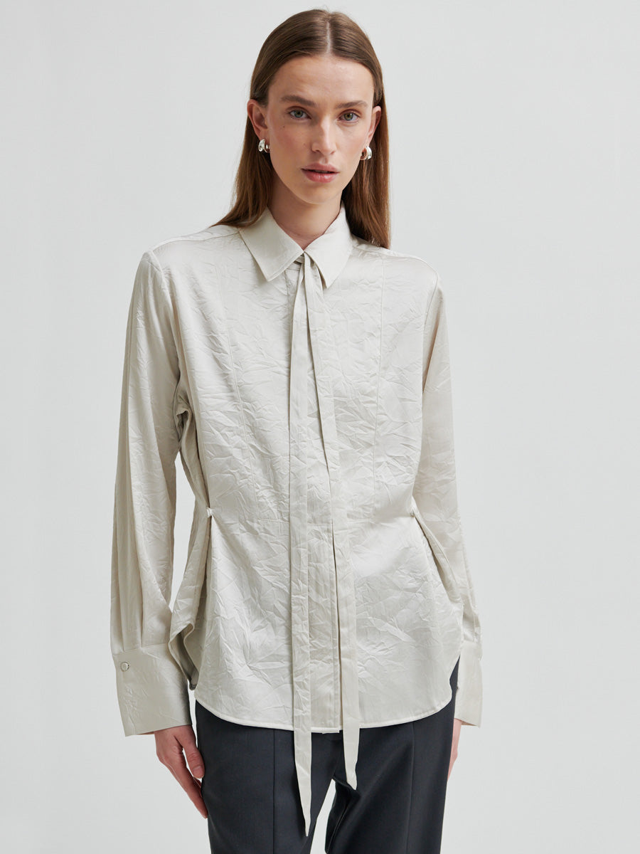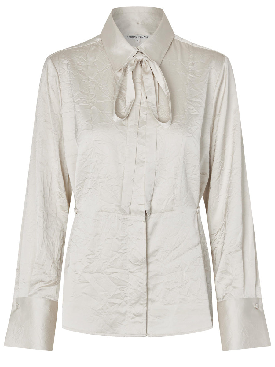 Tämä Second Femalen paita on valmistettu laskeutuvasta viskoosisekoitteesta, jossa on eläväinen, rypytetty pinta. Klassista kaulusta täydentää piilonapitus, ja sivussa olevien nappien avulla paidan ilmettä voi muokata istuvammaksi. Irrotettava kaulahuivi lisää monipuolisuutta.