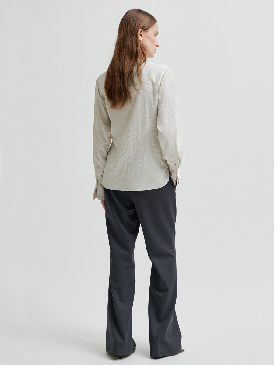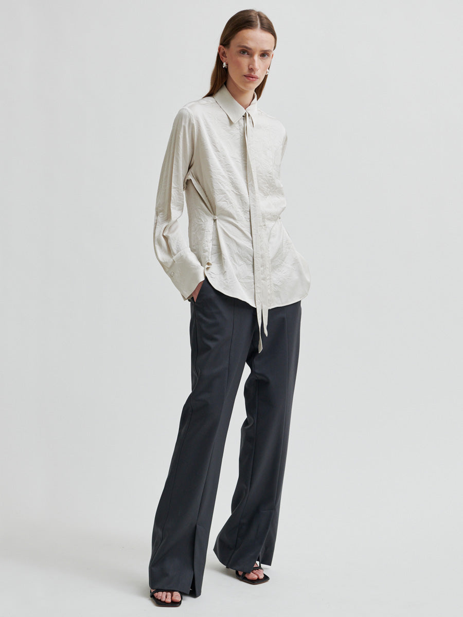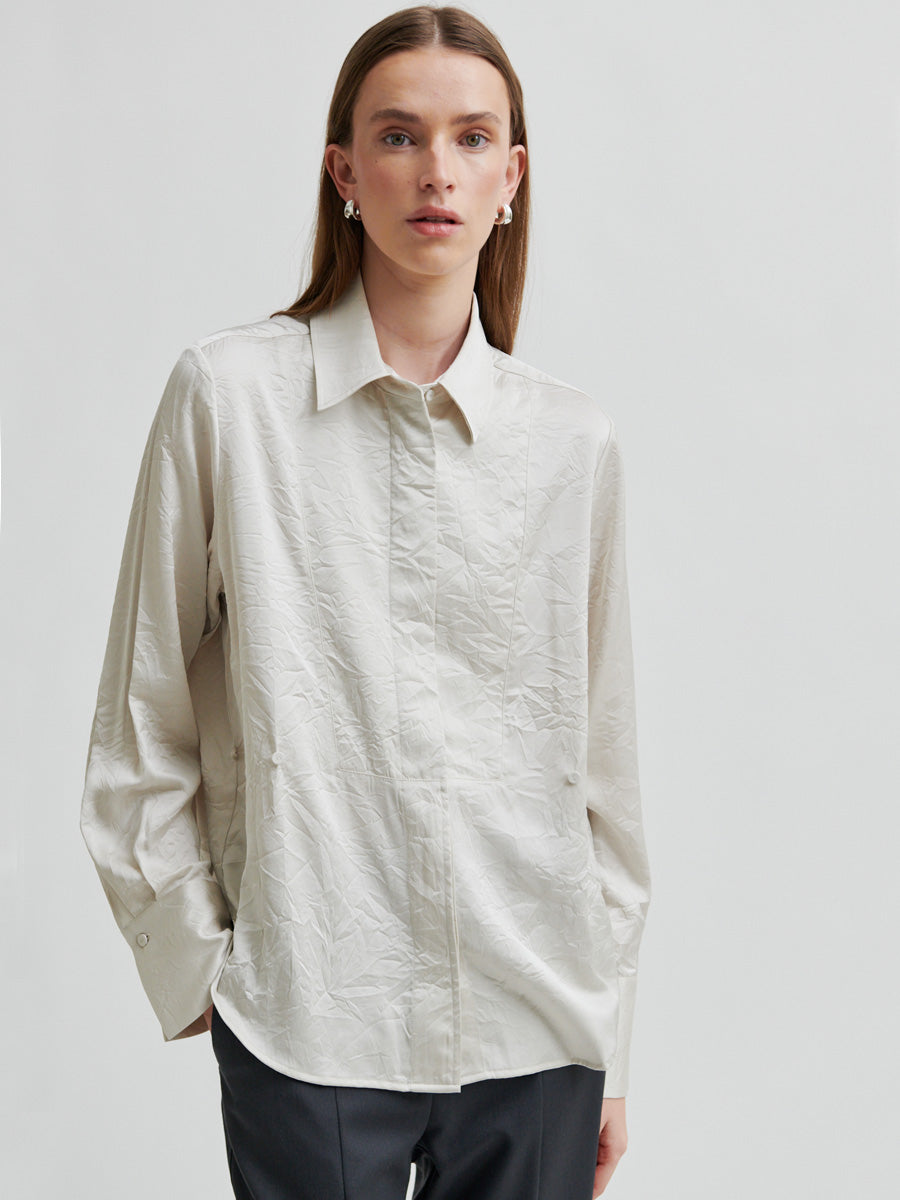 Tämä Second Femalen paita on valmistettu laskeutuvasta viskoosisekoitteesta, jossa on eläväinen, rypytetty pinta. Klassista kaulusta täydentää piilonapitus, ja sivussa olevien nappien avulla paidan ilmettä voi muokata istuvammaksi. Irrotettava kaulahuivi lisää monipuolisuutta.