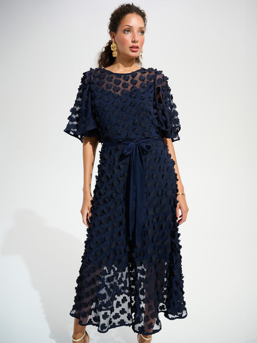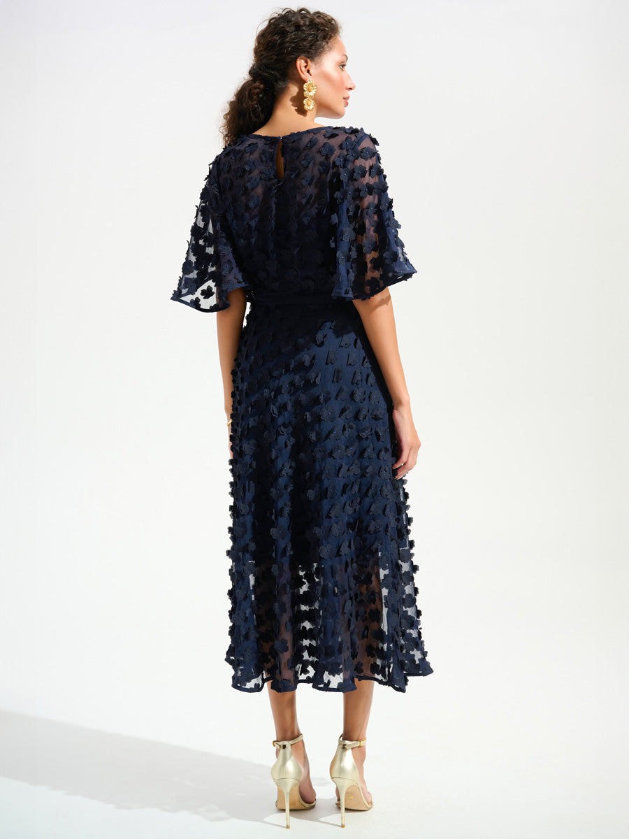 Tässä Joseph Ribkoffin mekossa kohopintainen kukkakirjailu tuo asuun hienostunutta tekstuuria ja keveyttä. Fit & flare -malli korostaa vyötäröä kauniisti, ja herkät röyhelöhihat sekä vyöllä sidottu vyötärö viimeistelevät naisellisen siluetin. Pehmeästi laskeutuva midimitta tekee mekosta tyylikkään valinnan juhlaan ja erityisiin hetkiin.