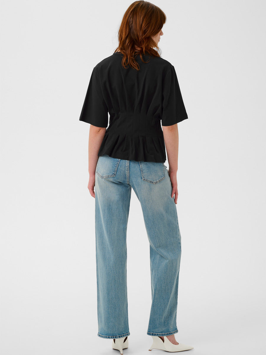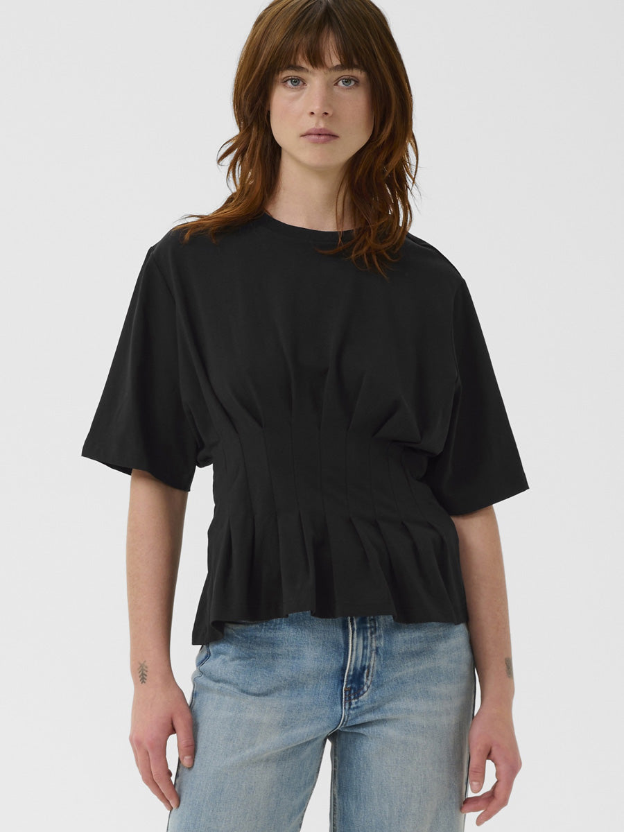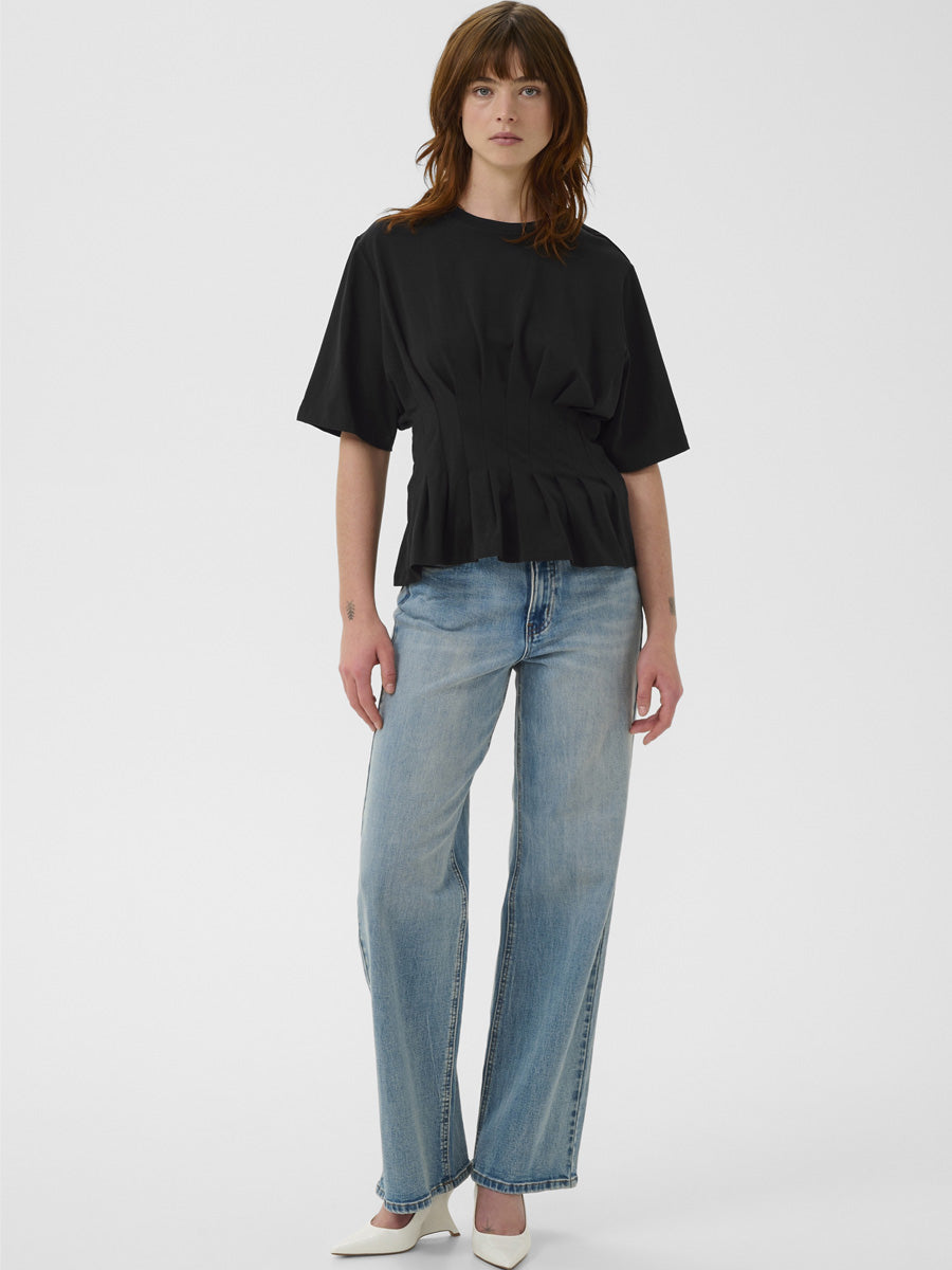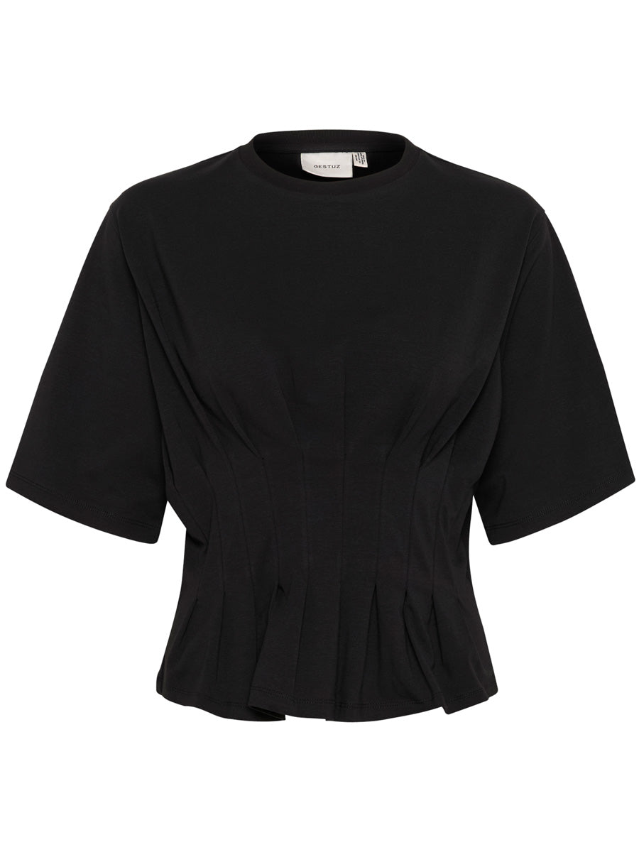 Tässä Gestuzin t-paidassa istuva malli, muotoilevat saumat ja väljät lyhyet hihat tuovat ryhdikkään ja trendikkään ilmeen. Pyöreä pääntie ja helmassa olevat laskokset korostavat vyötäröä ja tekevät t-paidasta huolitellun luottotuotteen arkeen. Malli on 179 cm ja päällään koko S.