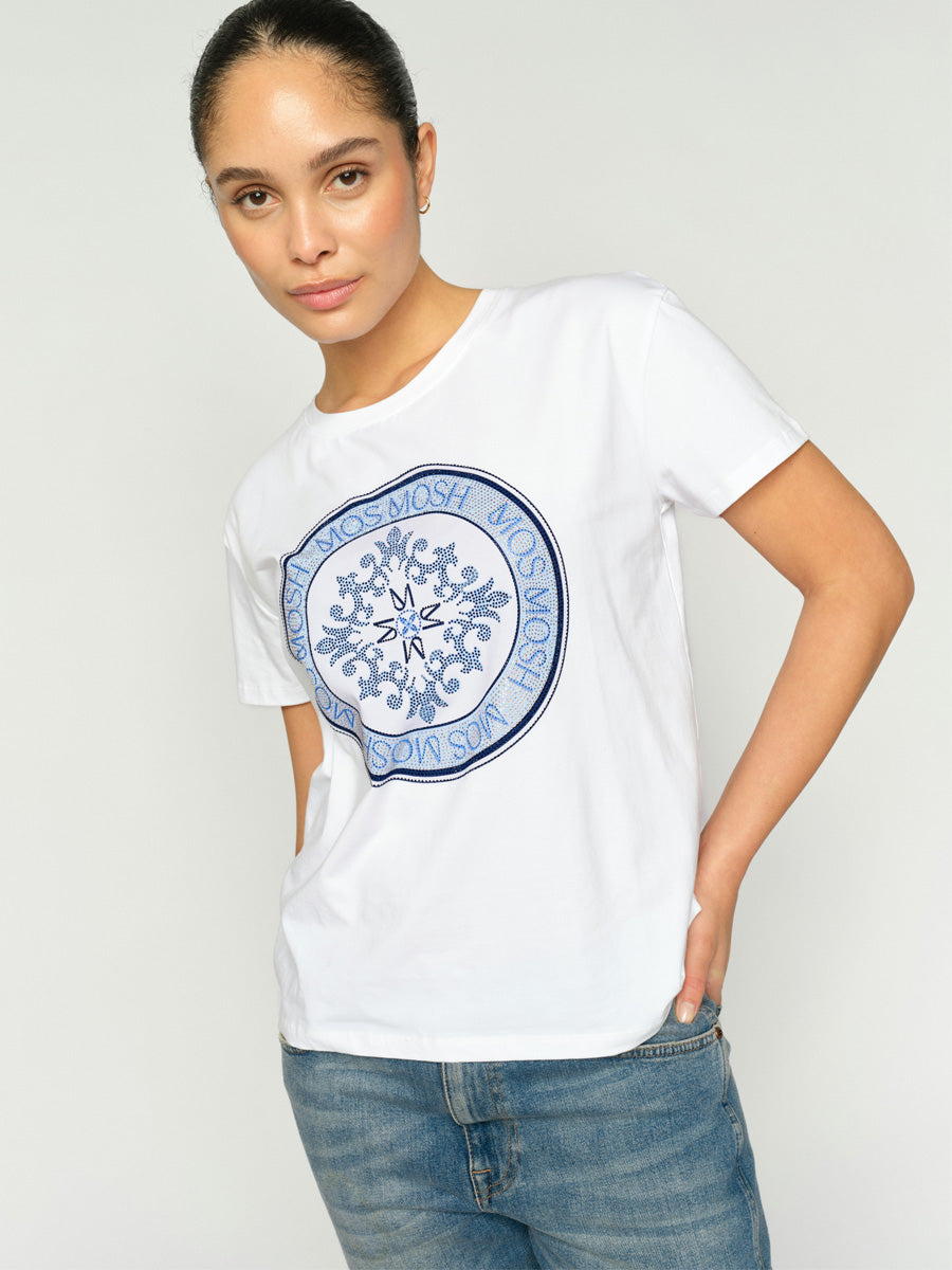 Tämä Mos Moshin t-paita tuo klassiseen perusmalliin näyttävän yksityiskohdan. Pehmeä puuvillasekoite tuntuu miellyttävältä päällä, ja suora istuvuus tekee paidasta helpon käyttää. Pyöreä pääntie ja edessä oleva graafinen printti antavat ilmeelle luonnetta. Toimii arjessa farkkujen kanssa tai viimeistelee rennon siistin asun housujen parina.
