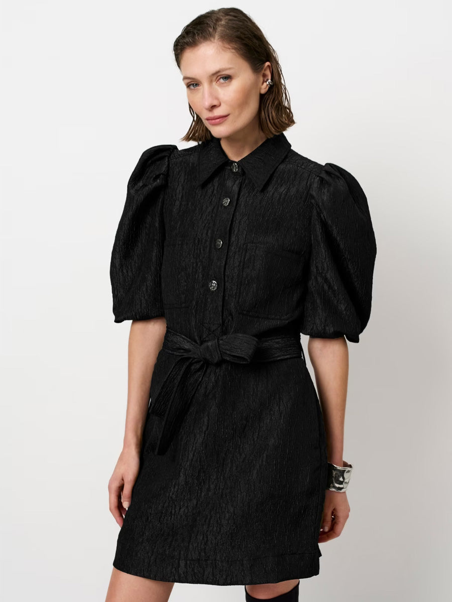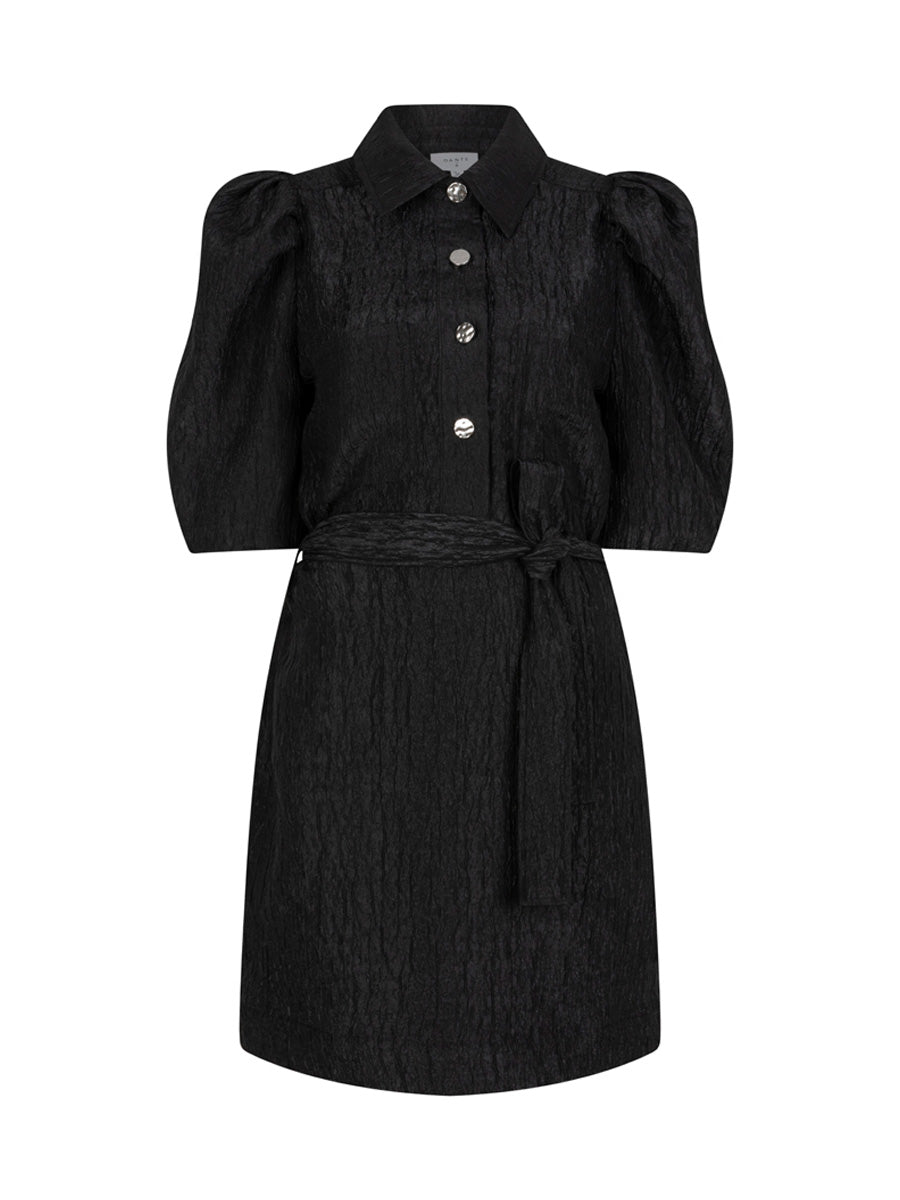 Tässä Danten Koda-mekossa klassinen paitamekko saa ylellisen päivityksen kolmiulotteisen jacquard-kankaan ansiosta. Mekossa on paitakaulus, edessä koristeelliset napit ja puolipitkät, kevyesti puffatut hihat, jotka tuovat asuun leikkisyyttä. Sivuissa oleva vetoketju ja vyötäröä korostava, samaa kangasta oleva vyö viimeistelevät tyylikkään ja huolitellun kokonaisuuden. Malli on 178 cm pitkä ja päällään koko 36.