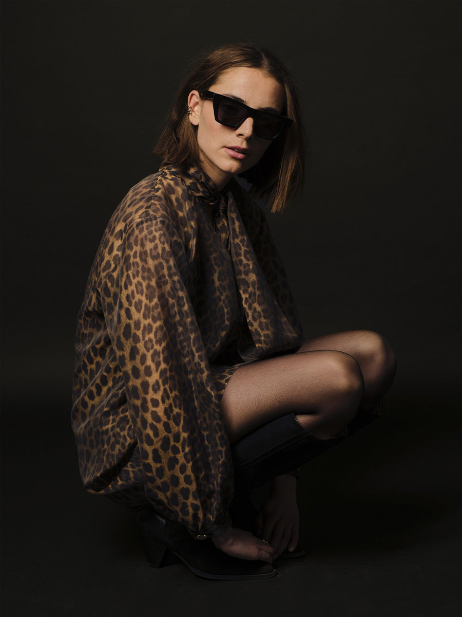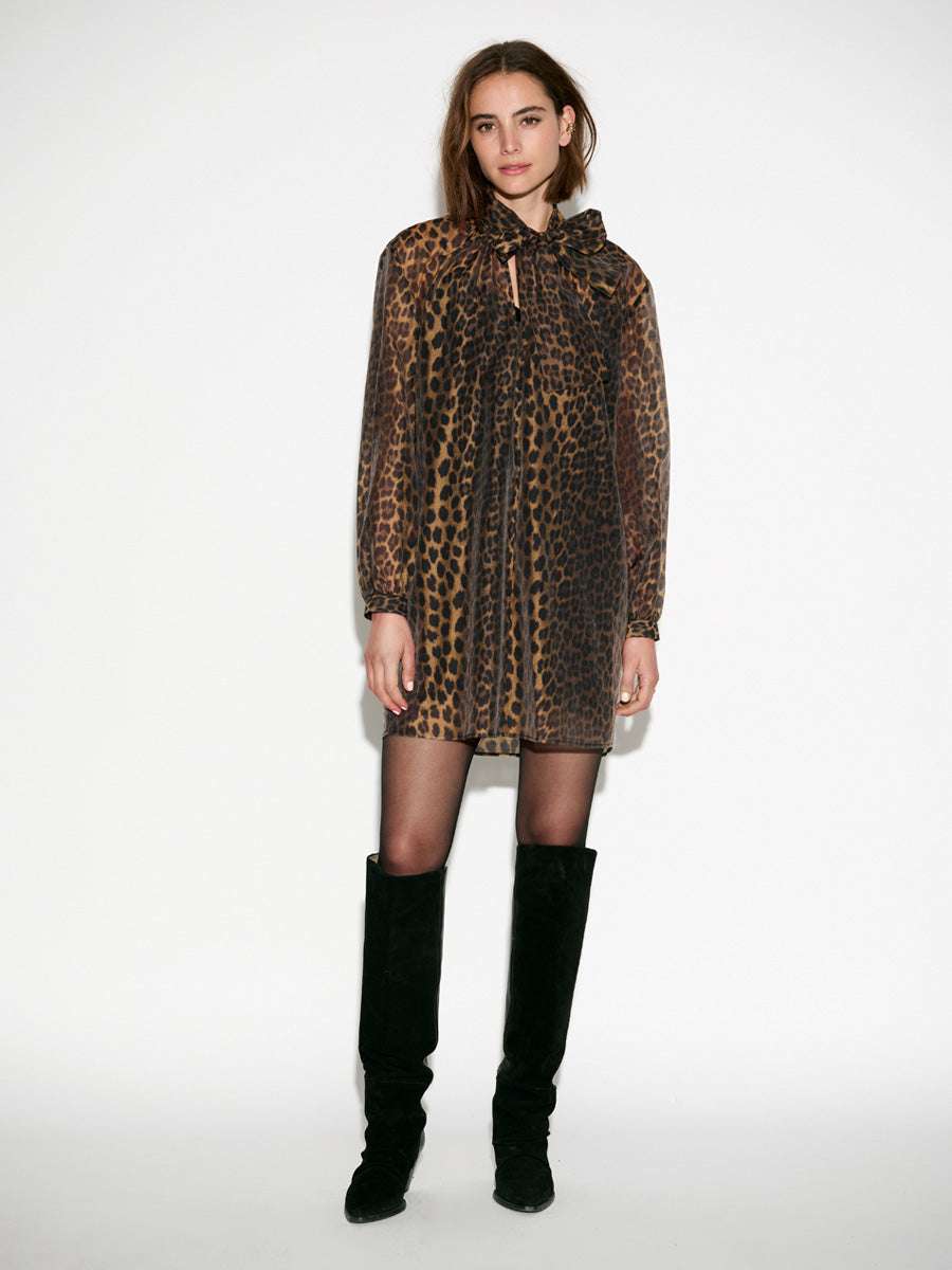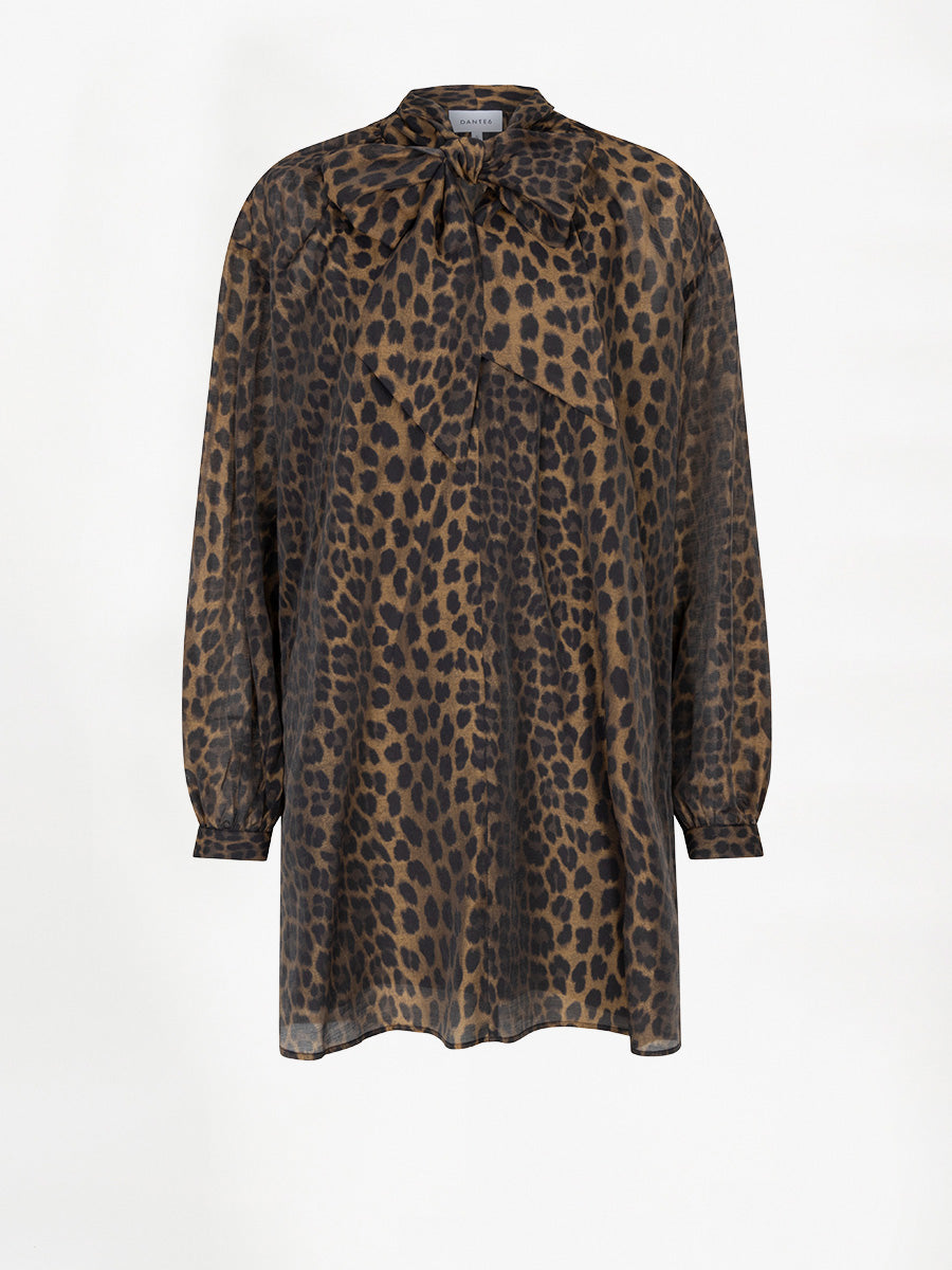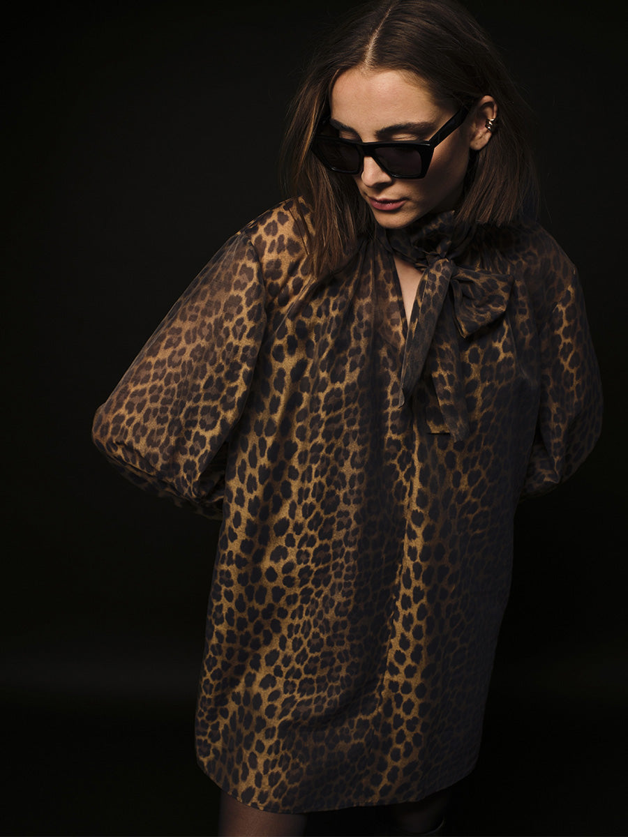 Tässä Leigh-mekossa leopardikuosi saa pehmeän ja ylellisen ilmeen kevyen Tencel-sekoituksen ja viskoosivuorin ansiosta. A-linjainen, rennosti laskeutuva mini-mitta on helppo pukea arkeen ja iltaan, ja kauluksen solmittava huivi antaa asuun monipuoliset stailausmahdollisuudet. Pitkät hihat, sivutaskut ja niskassa oleva hienovarainen rypytys viimeistelevät ilmeen – mukana tulee myös erillinen alusmekko mukavan istuvuuden takaamiseksi.