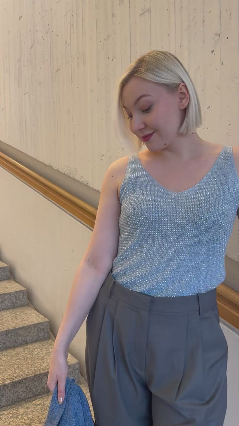 Tämä säihkyvä toppi on täydellinen valinta juhlahetkiin. Ribbineuloksesta valmistettu metallinhohtoinen materiaali heijastaa valoa kauniisti ja tuo asuun näyttävyyttä. Edessä ja takana toistuva V-pääntie korostaa imartelevaa siluettia, ja hienostuneet yksityiskohdat viimeistelevät ilmeen. Yhdistä housuihin tai hameeseen ja olet valmis loistamaan illanvietossa.