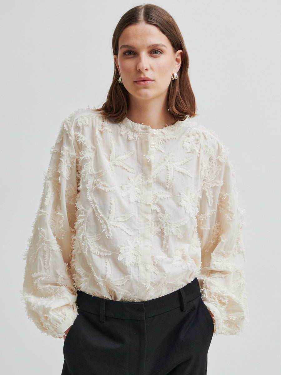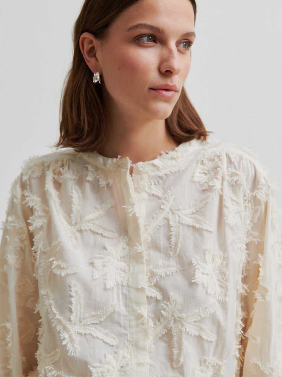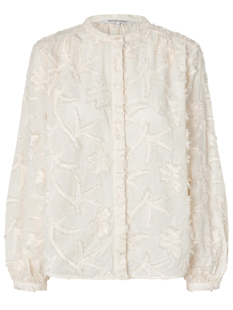 Tämä Second Femalen paita on valmistettu sileästä puuvillasekoitteesta, jota elävöittää kolmiulotteinen lehtikuvio. Mallissa on pyöreä kaulus ja nappikiinnitys koko pituudelta. Pitkät hihat ja suora istuvuus.