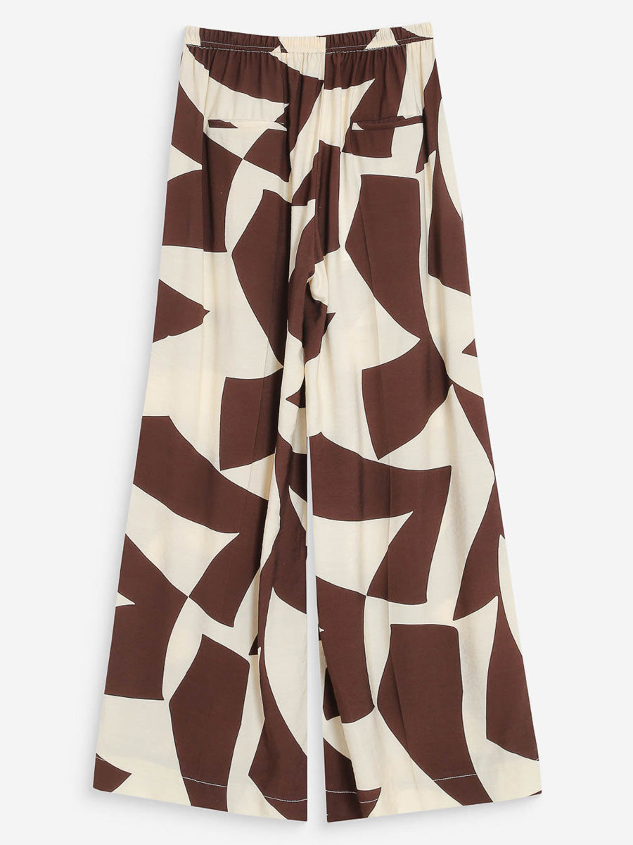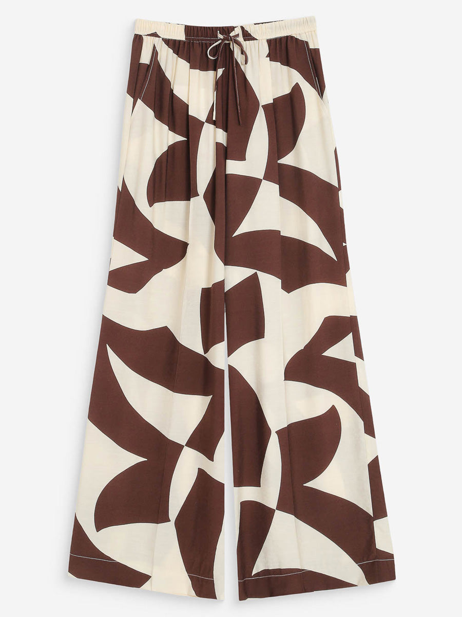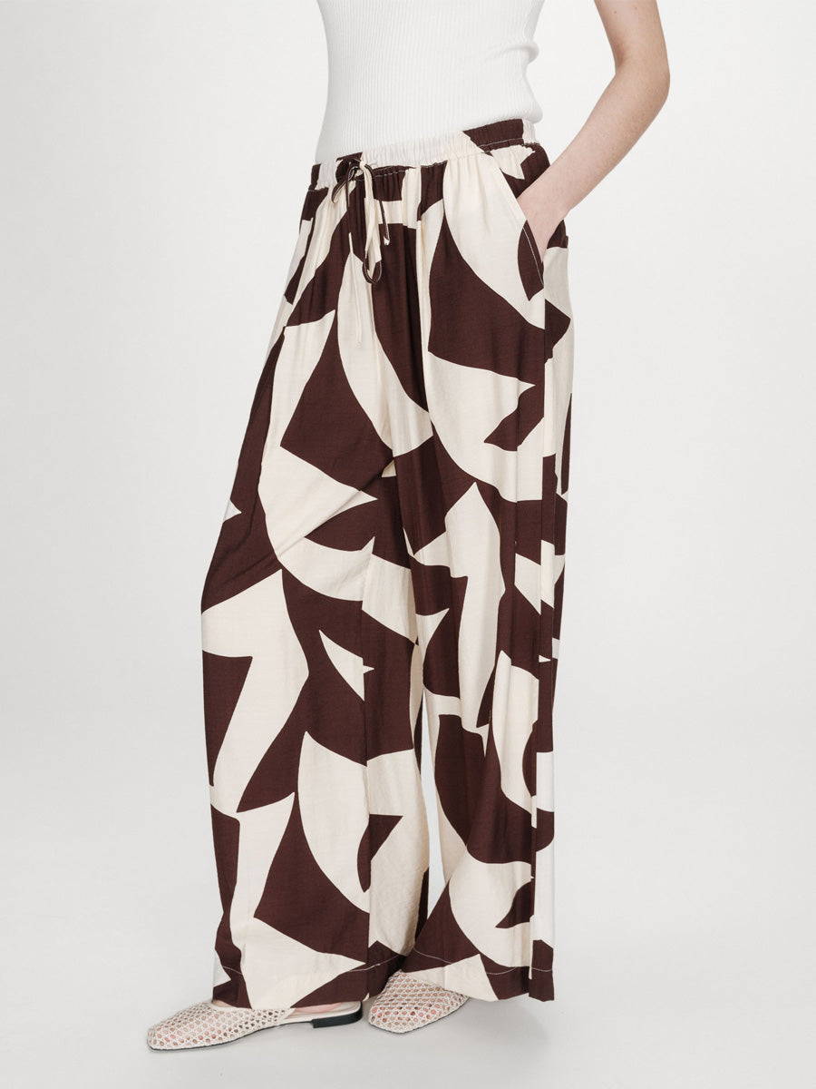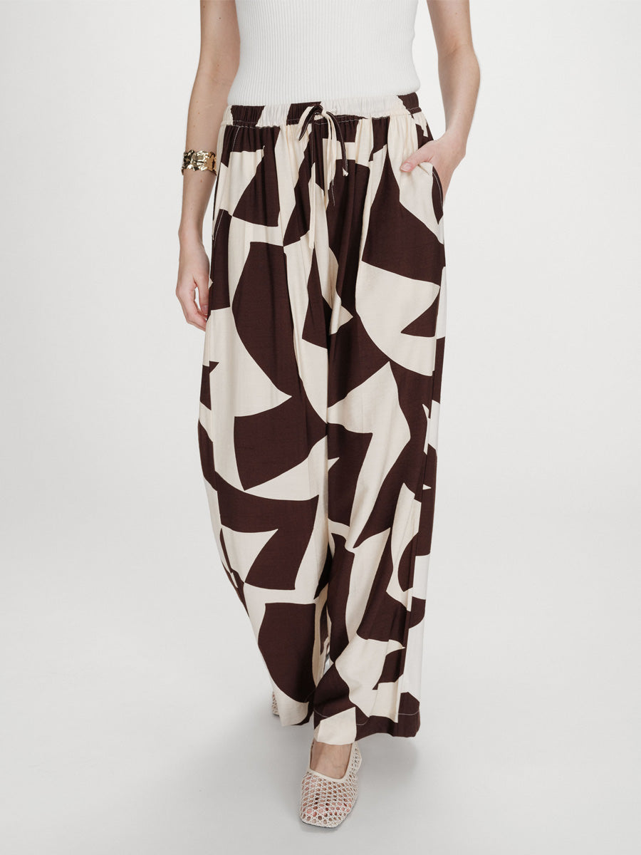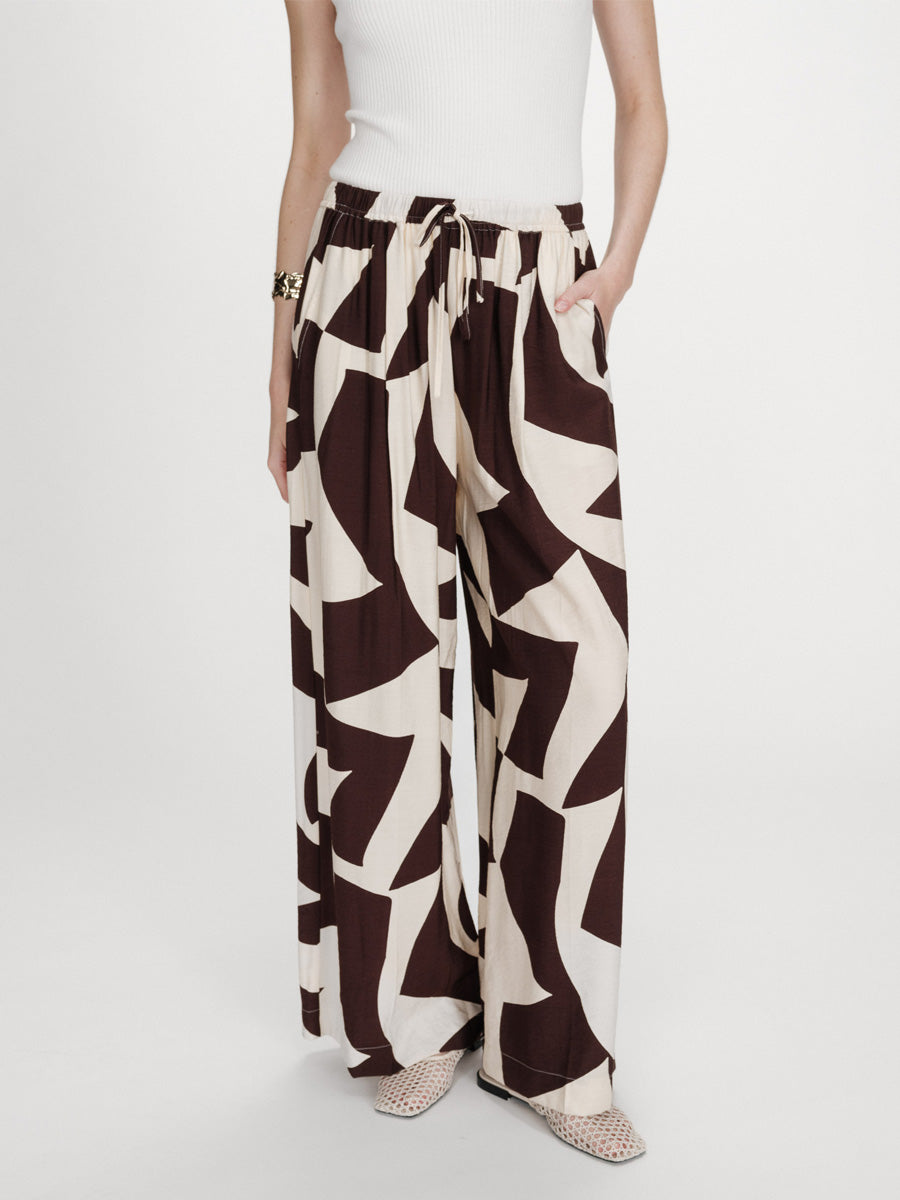 Näissä Grace & Milan housuissa graafinen kuosi tuo ilmettä selkeään, suoralinjaiseen siluettiin. Leveät, suorat lahkeet ja joustava vyötärö kiristysnyörillä tekevät housuista mukavat käyttää, ja etupuolen laskokset sekä viistot taskut viimeistelevät rennon kokonaisuuden.