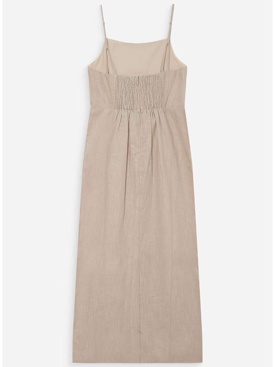 Tässä Grace & Milan mekossa puuvilla–pellavasekoite tuntuu kevyeltä ja miellyttävältä päällä. Vartalonmyötäinen leikkaus, säädettävät olkaimet ja smokkirypytetty selkä takaavat hyvän istuvuuden ja käyttömukavuuden. Takahalkio lisää liikkumavapautta, ja neliskulmainen pääntie viimeistelee selkeän ja harkitun ilmeen.
