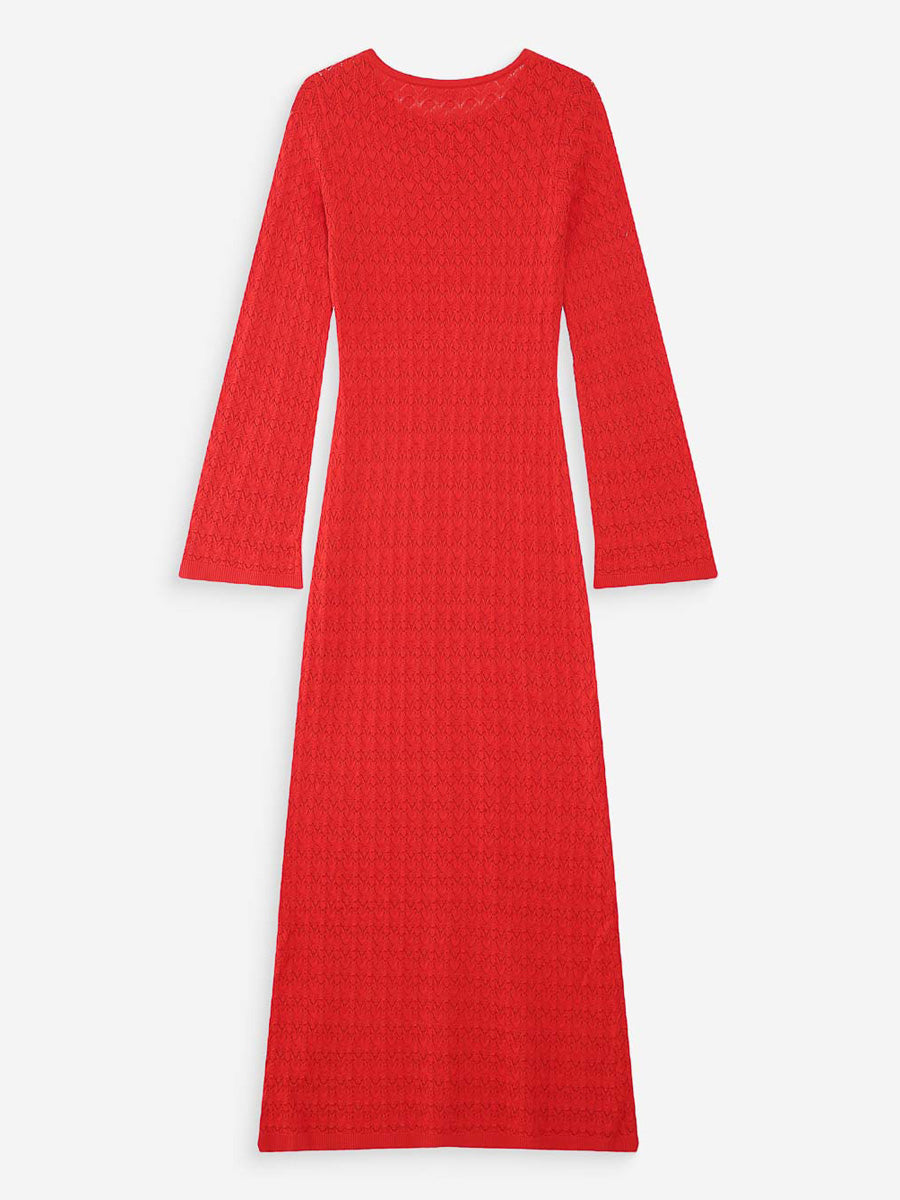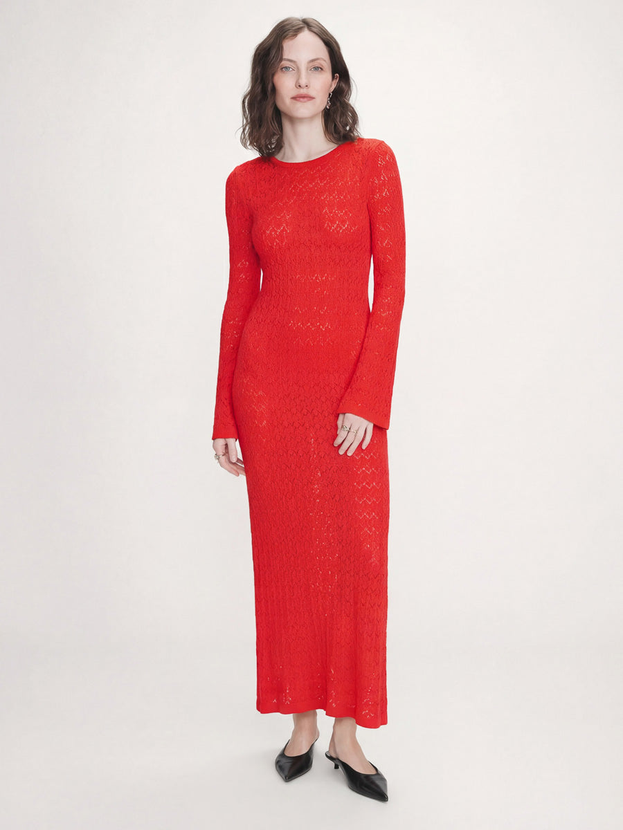 Tässä Grace & Milan mekossa pitkä ja vartalonmyötäinen siluetti korostuu näyttävällä reikäneuloksella. Pitkät, hieman levenevät hihat ja pyöreä pääntie pitävät kokonaisuuden selkeänä. Mekko laskeutuu kauniisti ja toimii katseenvangitsijana sellaisenaan.
