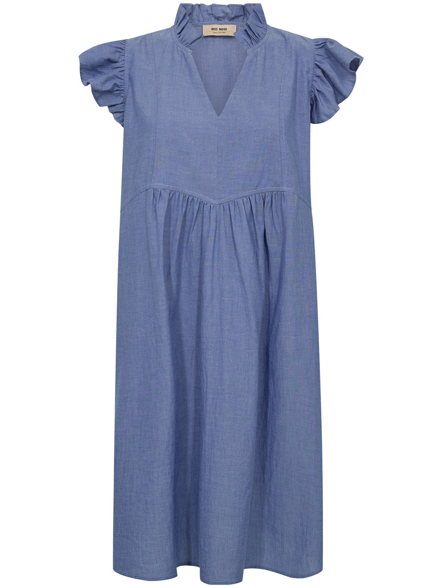 Tässä Mos Moshin mekossa rento malli ja kevyesti istuvampi yläosa luovat kauniin siluetin. Olkapäiden ja pääntien röyhelöt viimeistelevät naisellisen ilmeen. Sopii erinomaisesti niin rentoihin kesäpäiviin sandaalien kanssa kuin juhlavampiin hetkiin korkojen parina.
